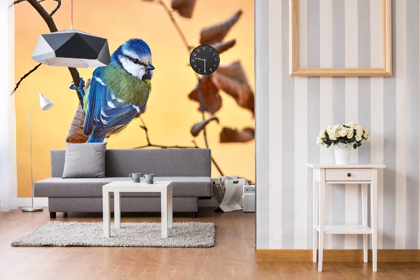Vlies Fototapete - Blaumeise auf kleinem Ast 375 x 250 cm