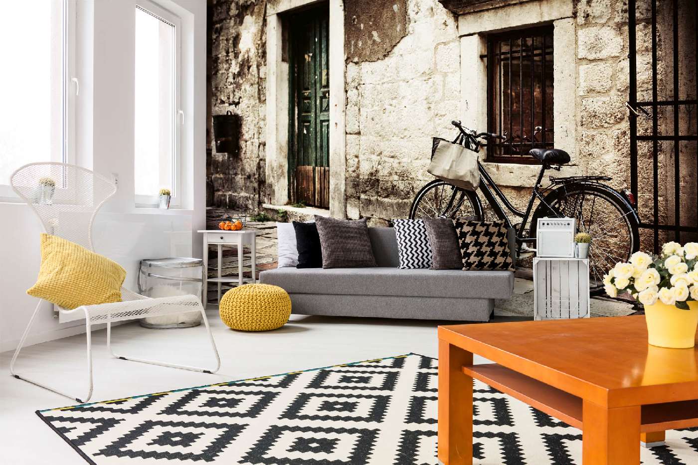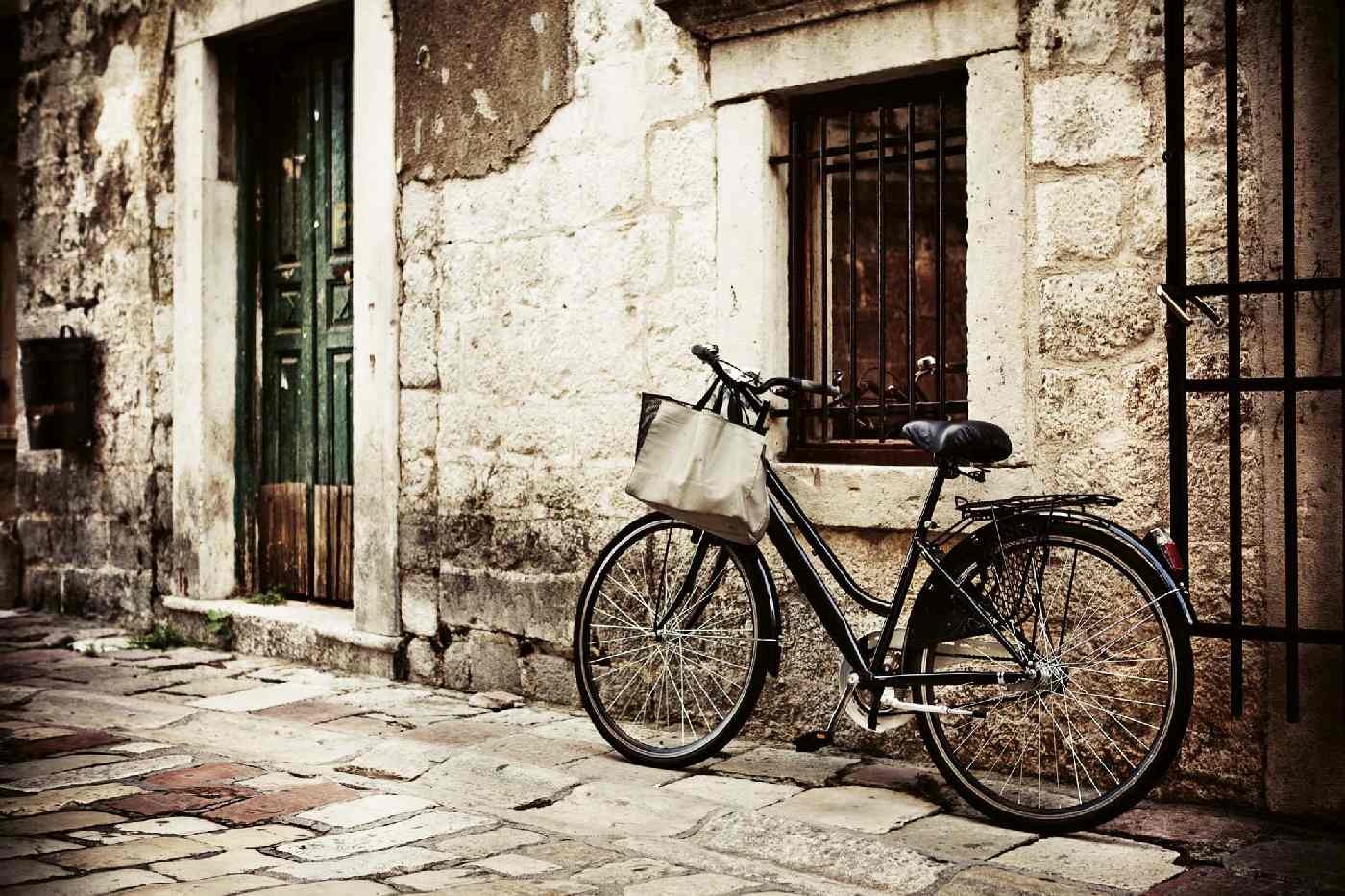 Vlies Fototapete - Fahrrad an der Steinmauer 375 x 250 cm