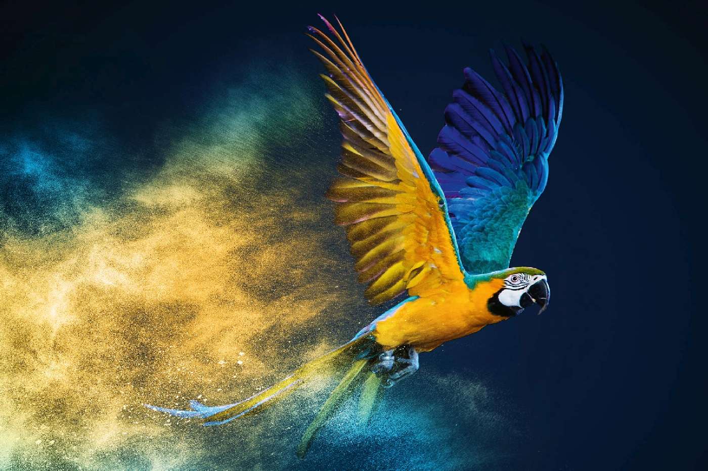 Vlies Fototapete - Fliegender Ara-Papagei 375 x 250 cm
