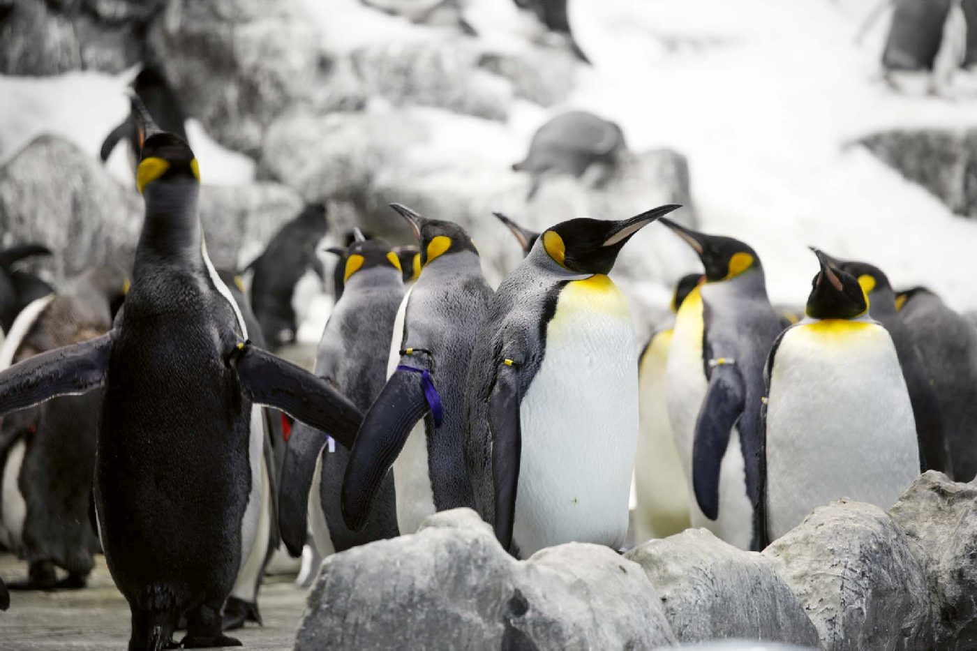 Vlies Fototapete - Kaiserpinguine auf Felsen 375 x 250 cm