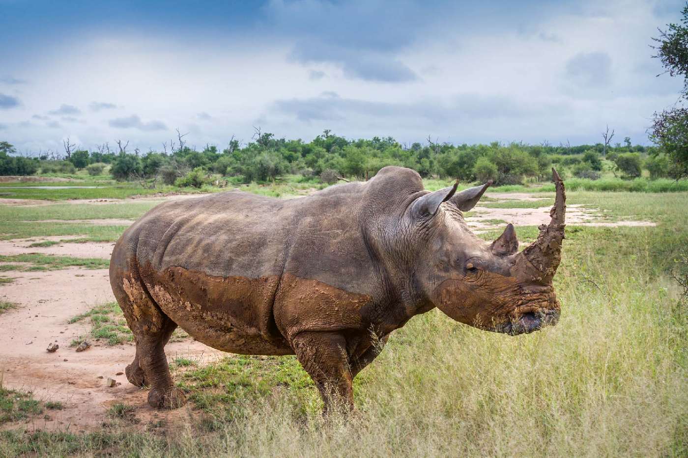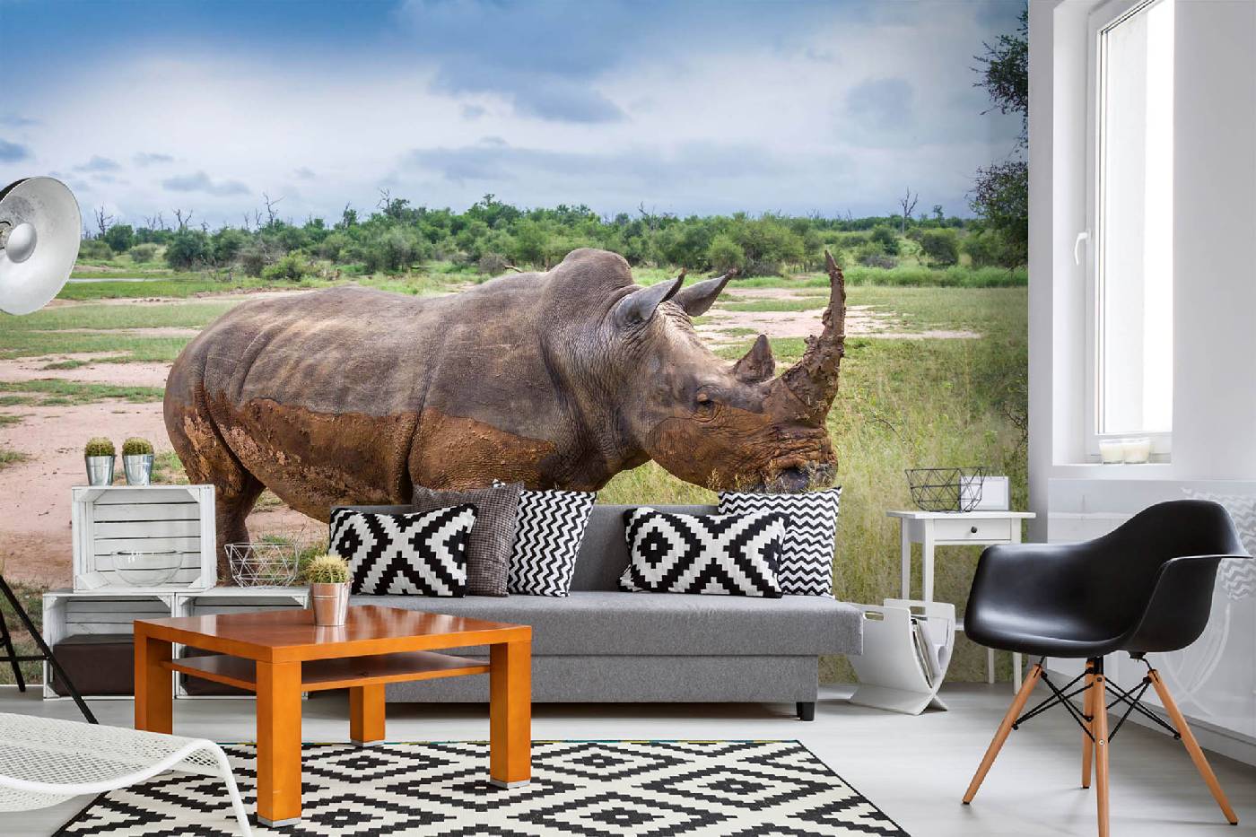 Vlies Fototapete - Nashorn im Weitwinkel 375 x 250 cm