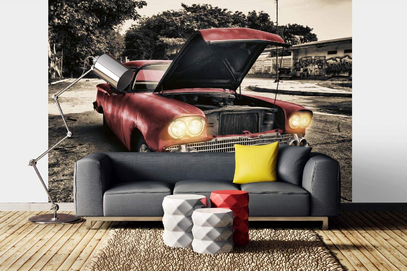 Vlies Fototapete - Altes rotes Auto 375 x 250 cm