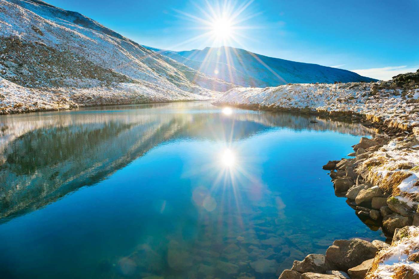 Vlies Fototapete - Blauer See in den Bergen 375 x 250 cm