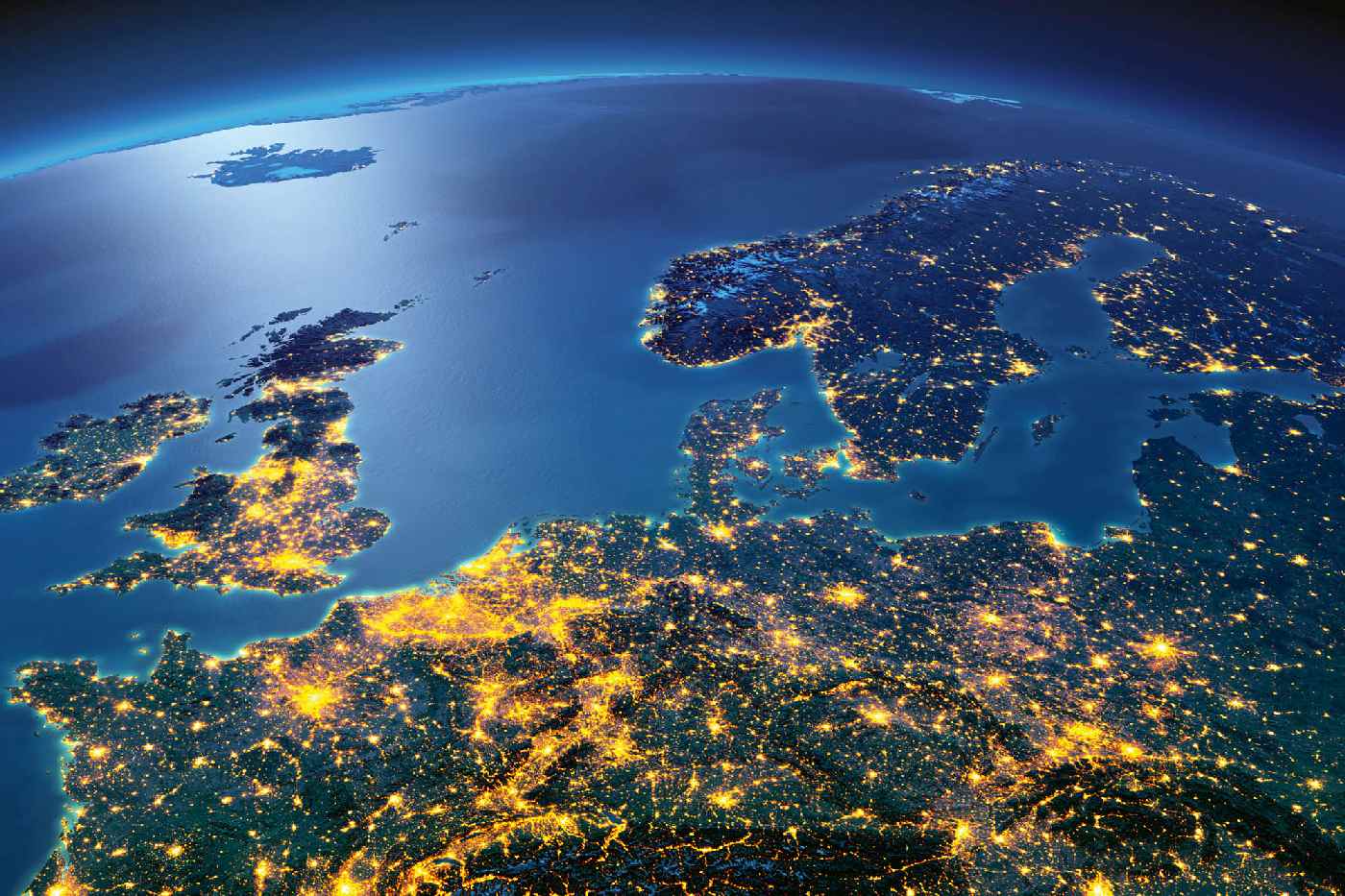 Vlies Fototapete - Europa aus dem Weltraum in der Nacht 375 x 250 cm