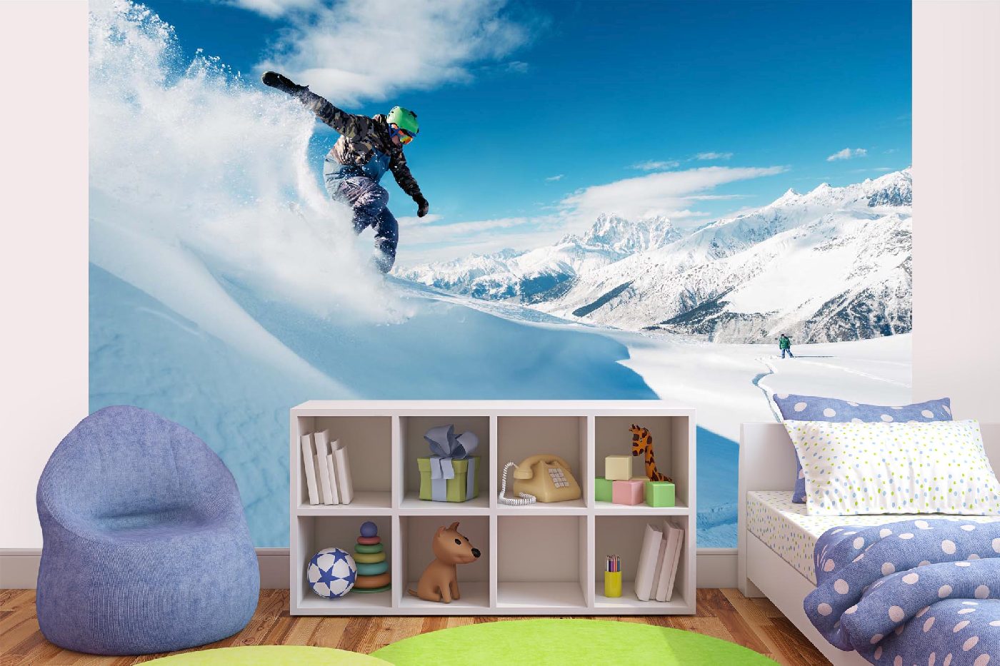 Vlies Fototapete - Fahrender Snowboarder 375 x 250 cm
