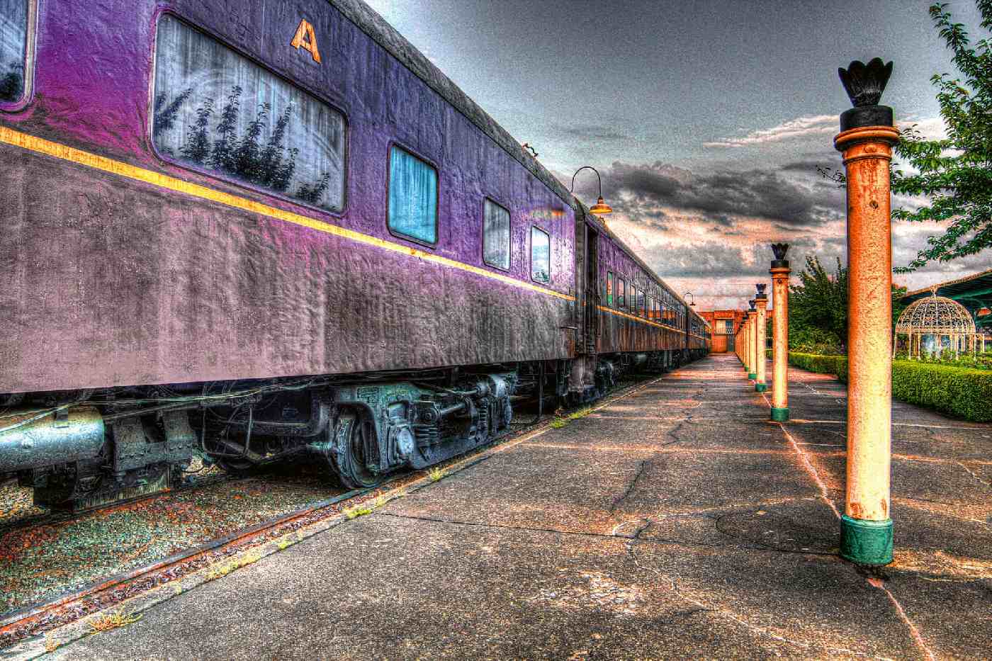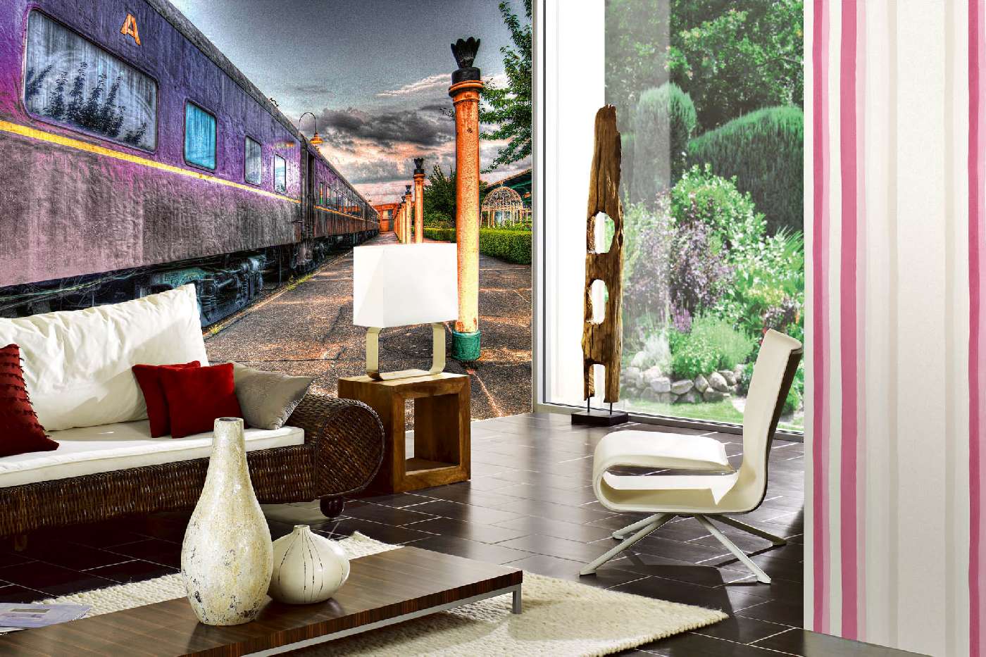 Vlies Fototapete - Lila Zug am Bahnhof 375 x 250 cm