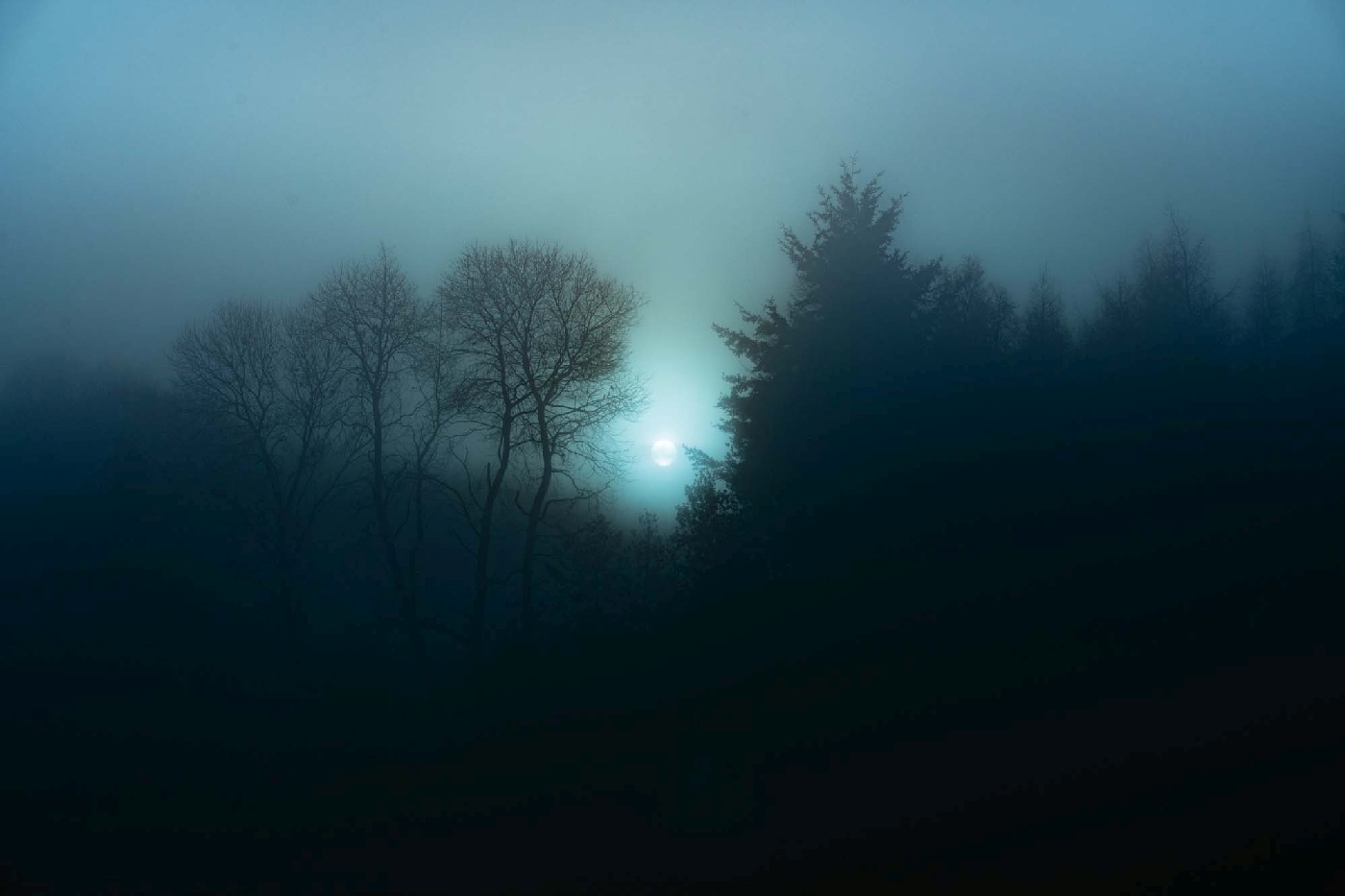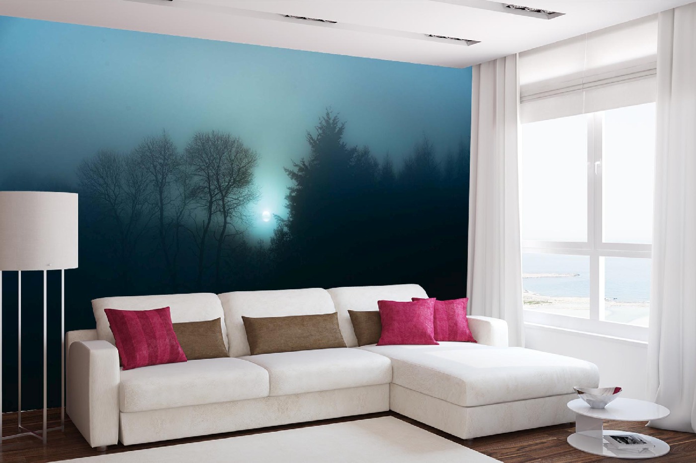 Vlies Fototapete - Nebliger Nachtwald 375 x 250 cm