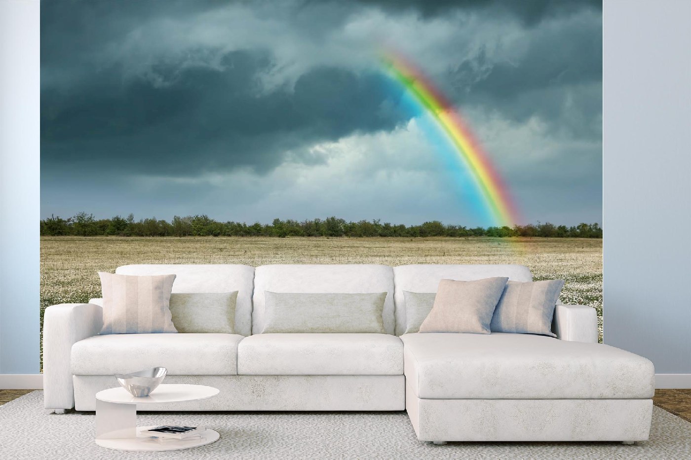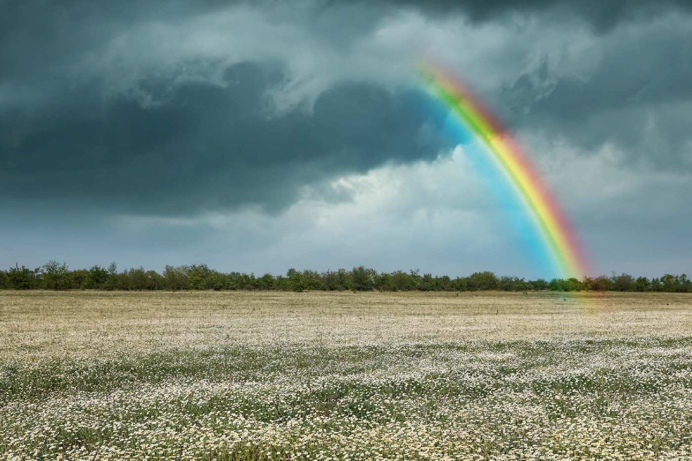 Vlies Fototapete - Regenbogen über dem Kamillenfeld 375 x 250 cm