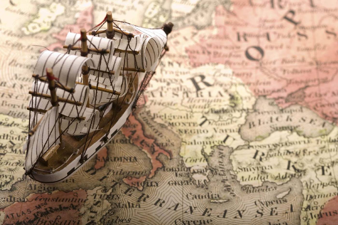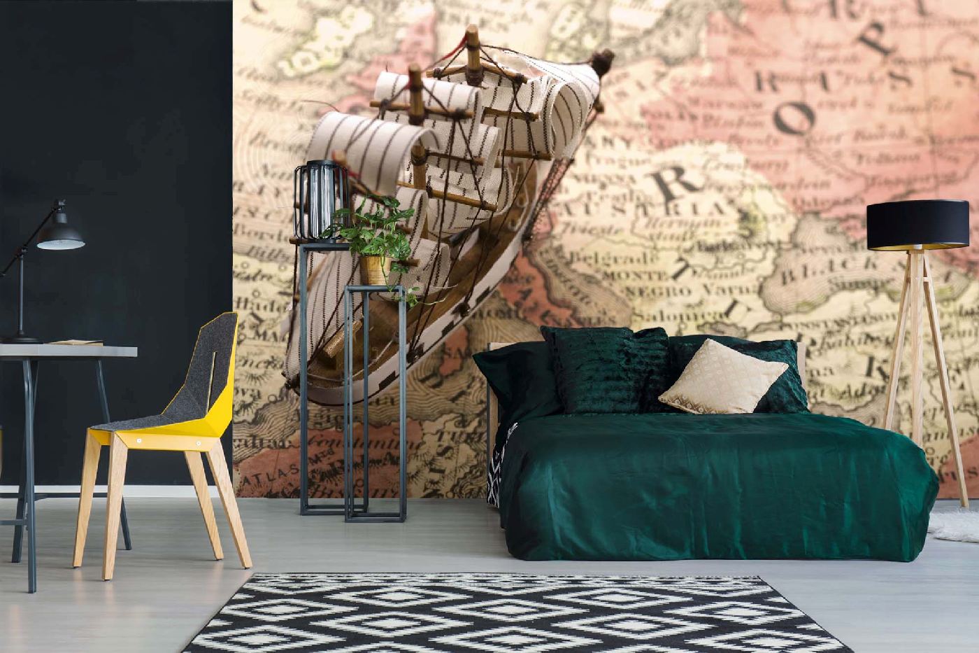 Vlies Fototapete - Schiffsmodell und alte Karte 375 x 250 cm