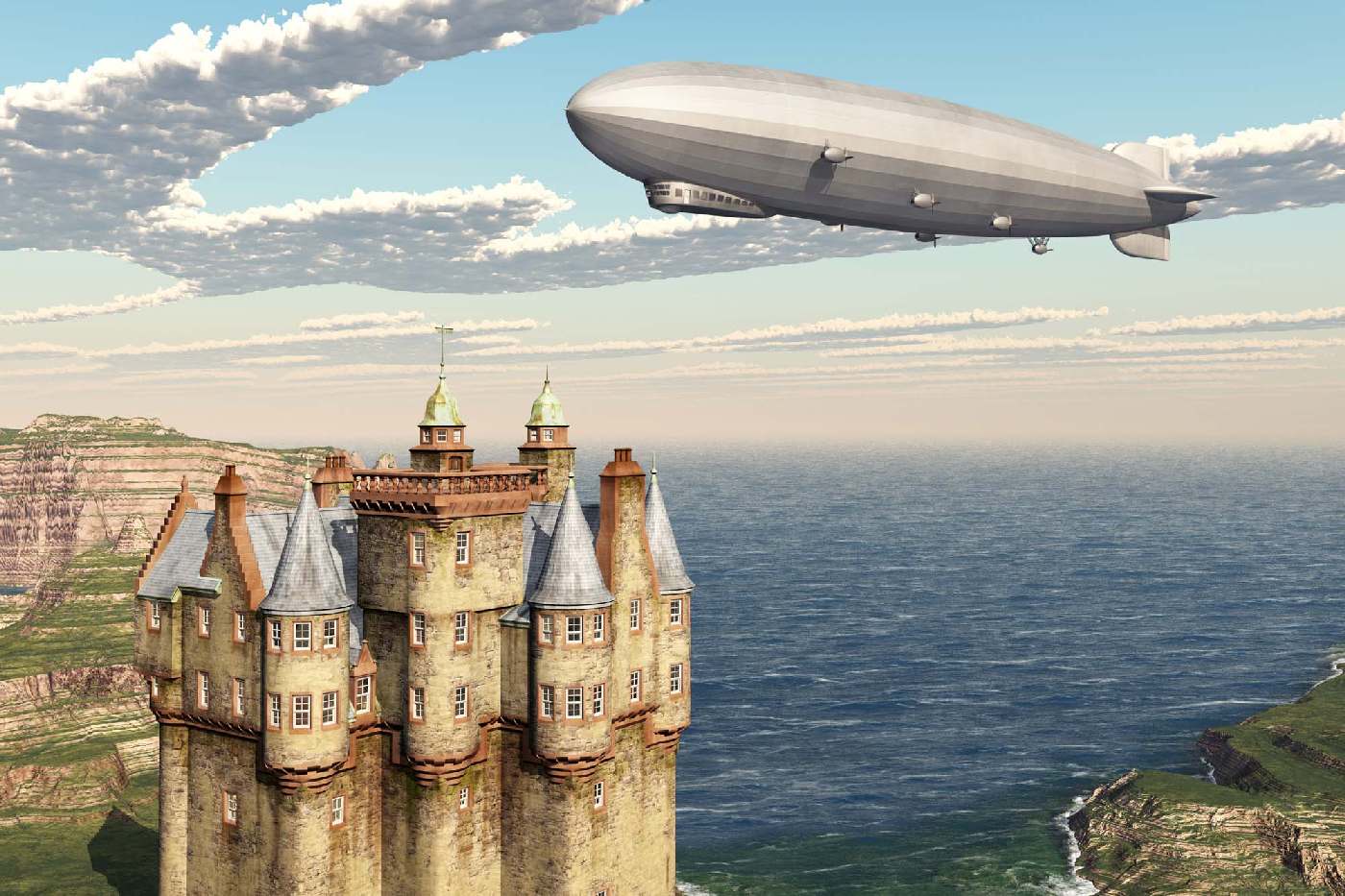 Vlies Fototapete - Schottisches Schloss und Luftschiff 375 x 250 cm