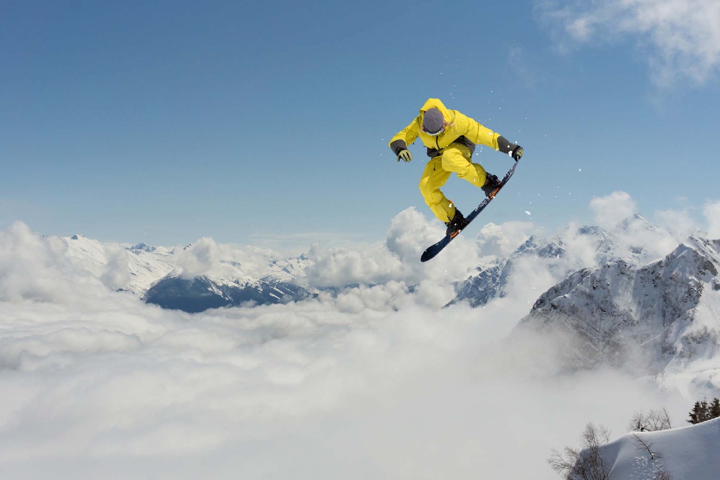 Vlies Fototapete - Springender Snowboarder 375 x 250 cm