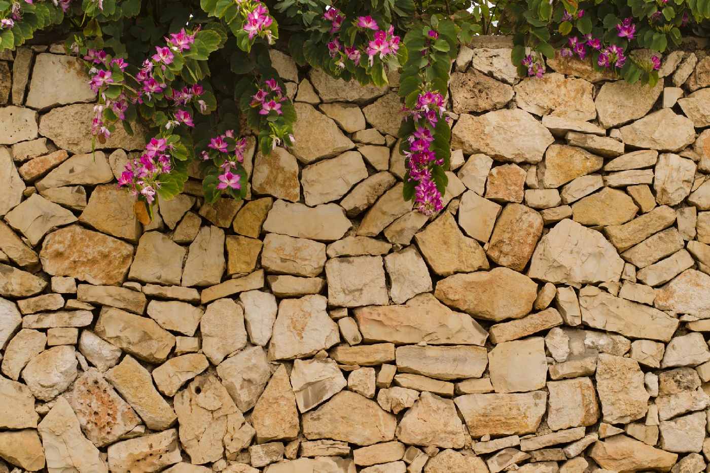 Vlies Fototapete - Steinmauer mit Blüten 375 x 250 cm