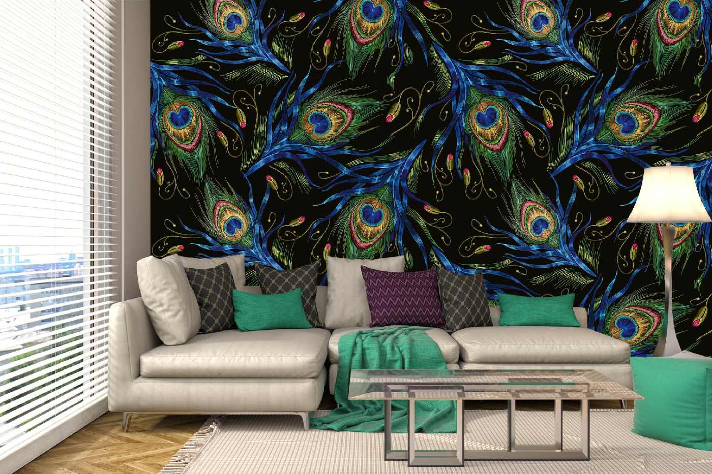 Vlies Fototapete - Stickmuster mit Pfauenfedern 375 x 250 cm