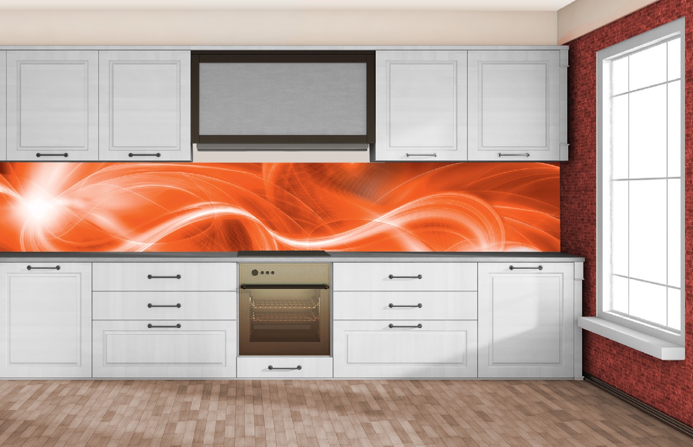 Küchenrückwandfolie lässt sich ausschließlich auf die nicht-saugfähige Unterlage kleben (Glas, Holz, keramische Fließen).