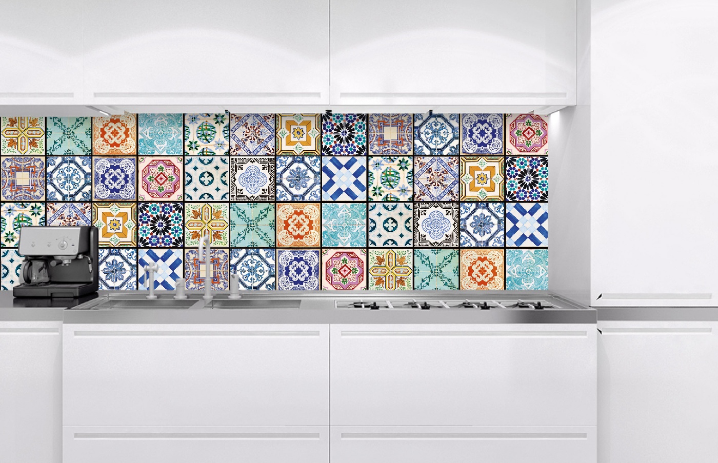 Küchenrückwandfolie lässt sich ausschließlich auf die nicht-saugfähige Unterlage kleben (Glas, Holz, keramische Fließen).