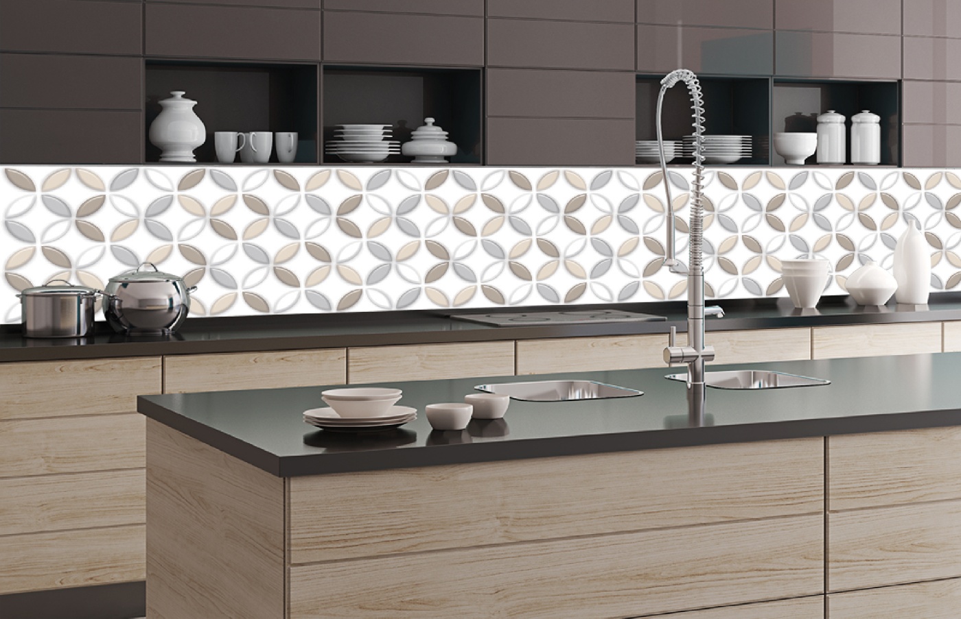 Küchenrückwandfolie lässt sich ausschließlich auf die nicht-saugfähige Unterlage kleben (Glas, Holz, keramische Fließen).