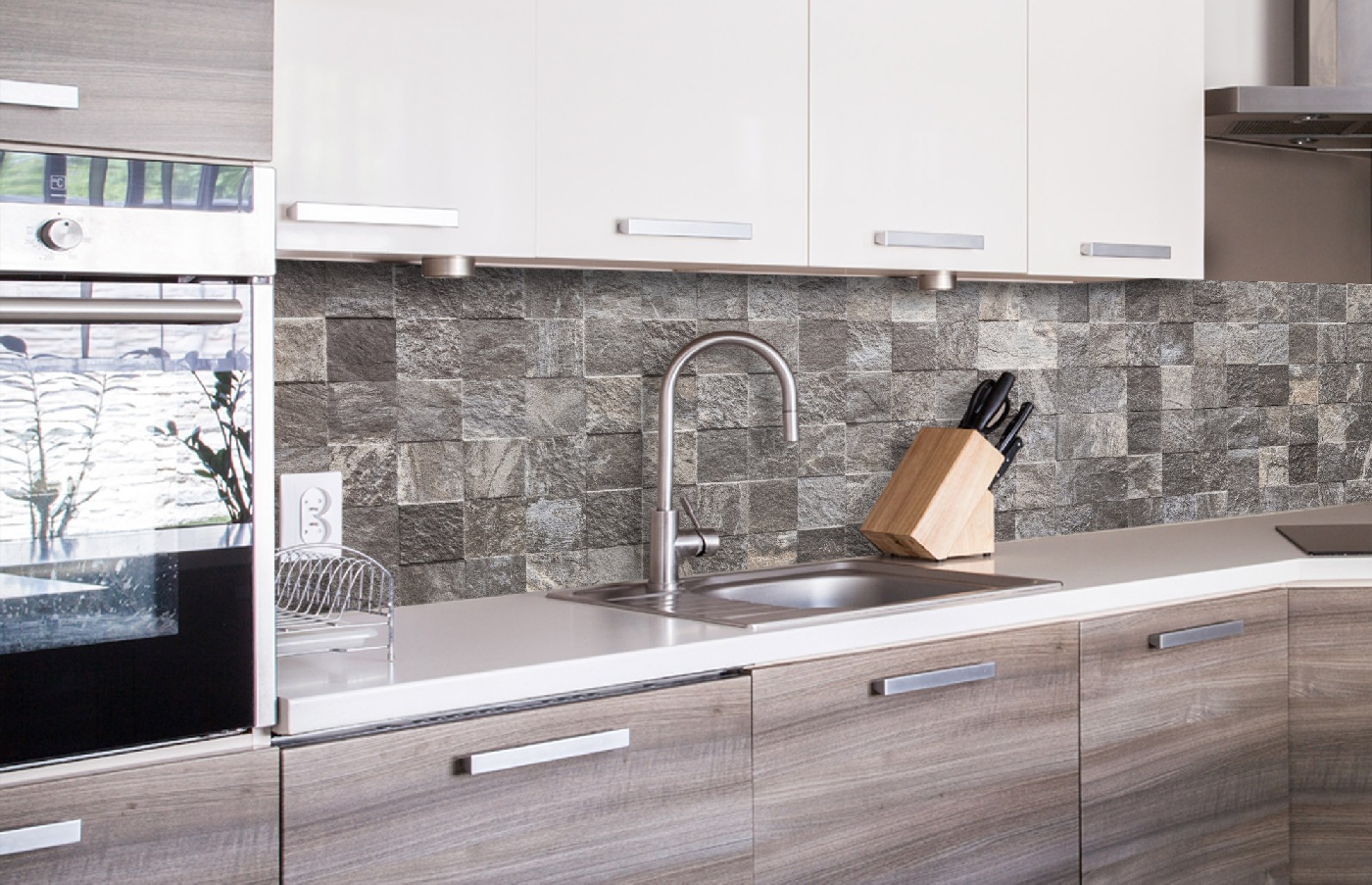 Küchenrückwandfolie lässt sich ausschließlich auf die nicht-saugfähige Unterlage kleben (Glas, Holz, keramische Fließen).