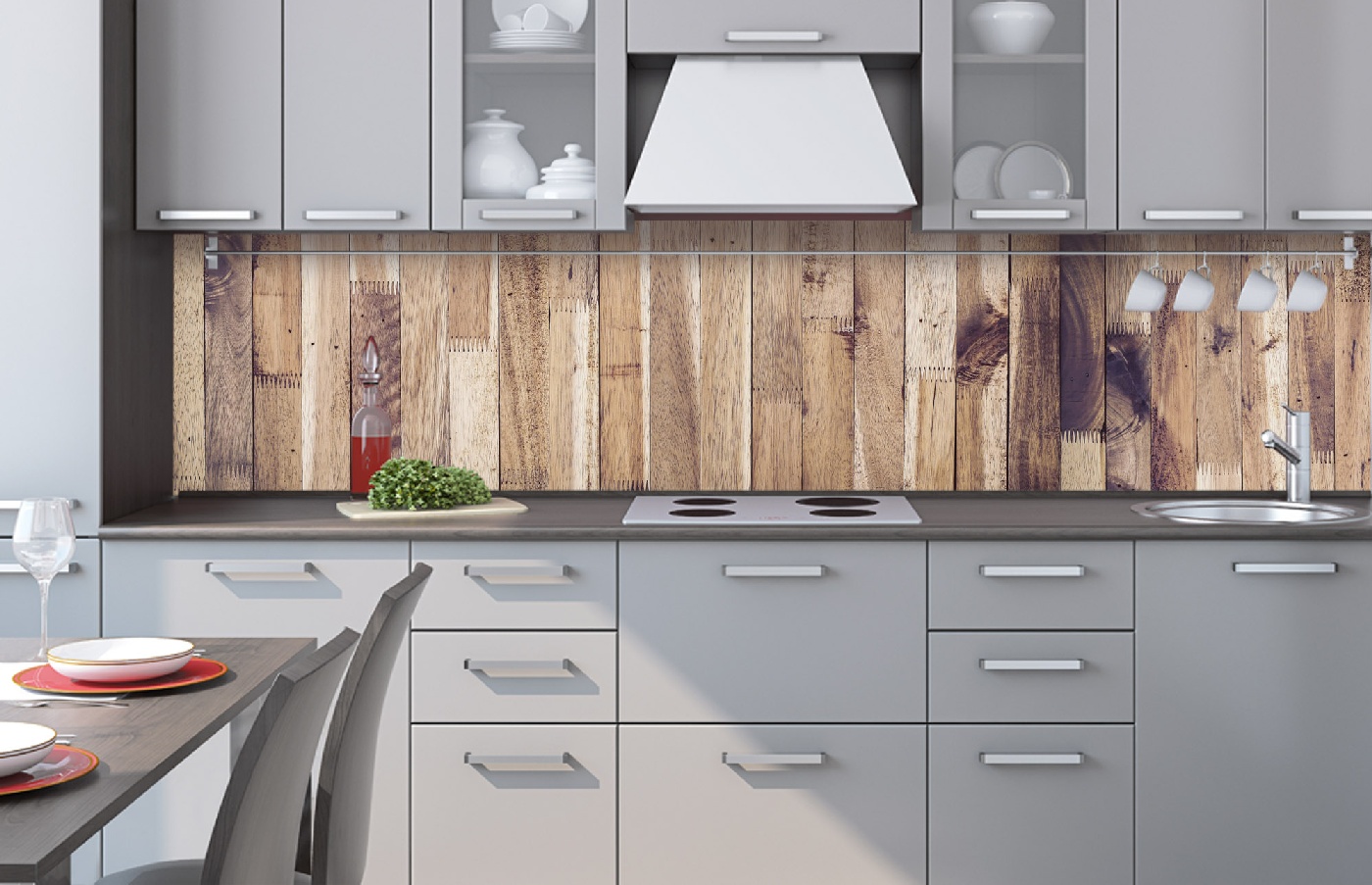 Küchenrückwandfolie lässt sich ausschließlich auf die nicht-saugfähige Unterlage kleben (Glas, Holz, keramische Fließen).