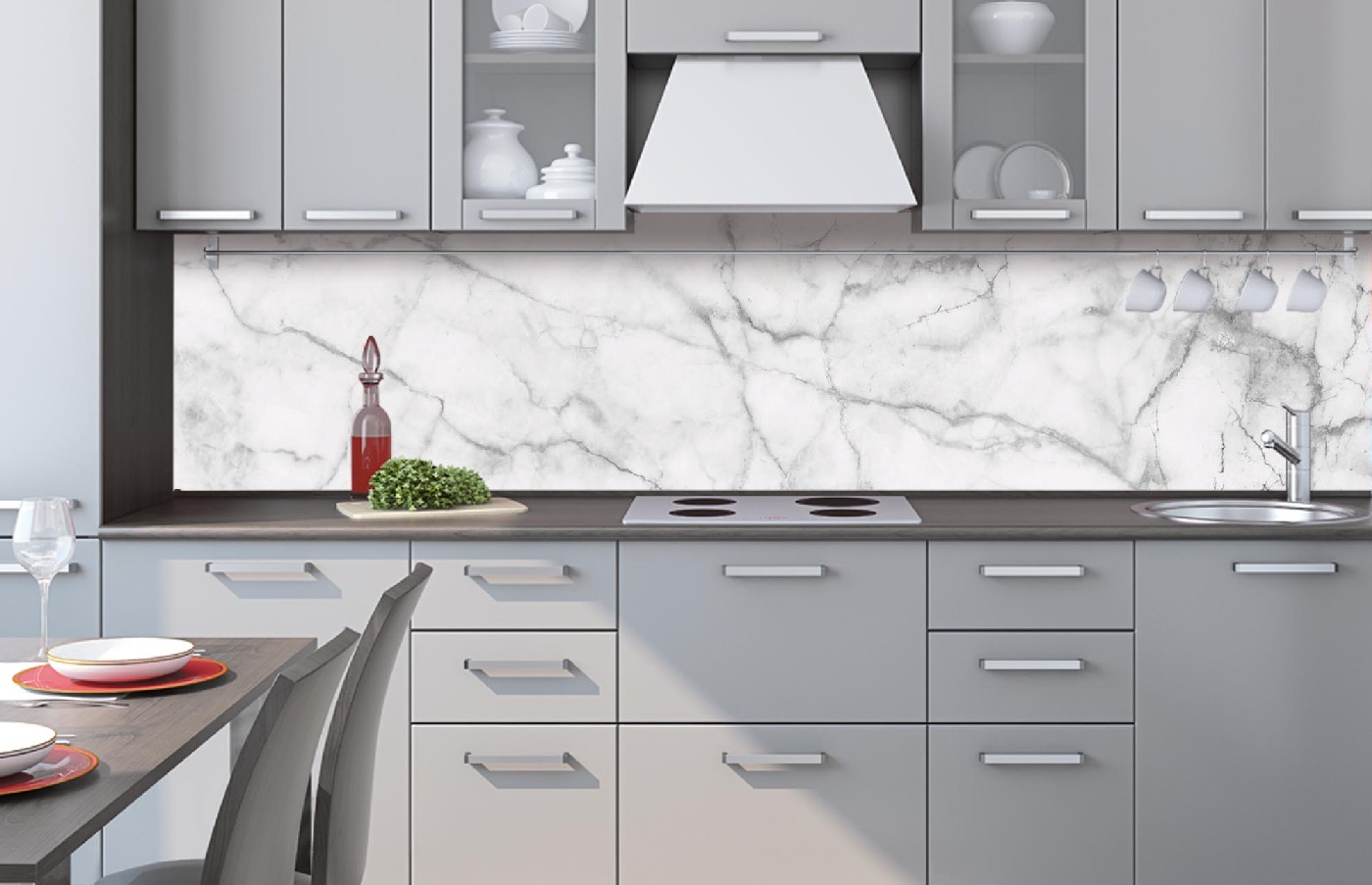 Küchenrückwandfolie lässt sich ausschließlich auf die nicht-saugfähige Unterlage kleben (Glas, Holz, keramische Fließen).