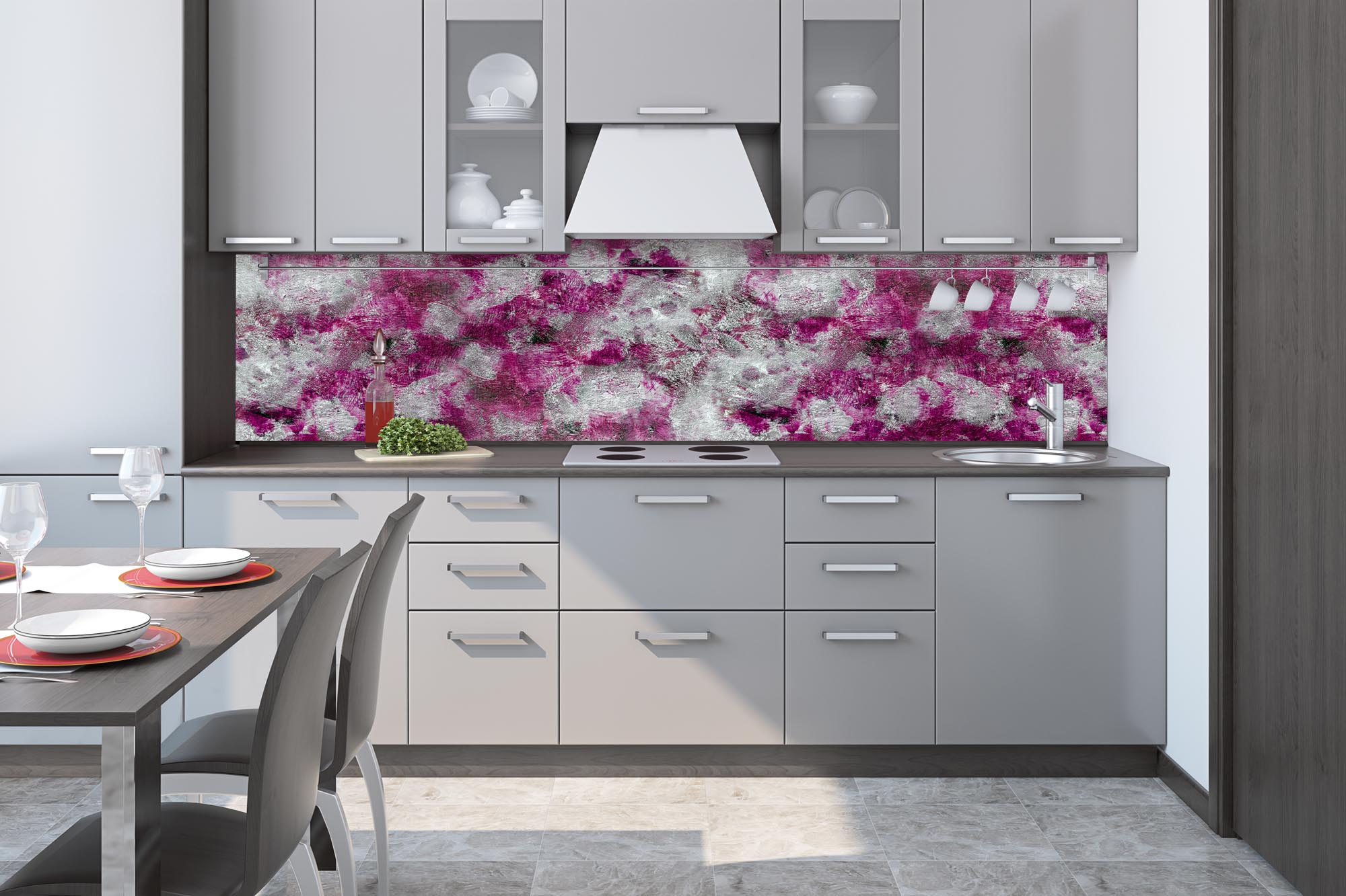 Küchenrückwandfolie lässt sich ausschließlich auf die nicht-saugfähige Unterlage kleben (Glas, Holz, keramische Fließen).