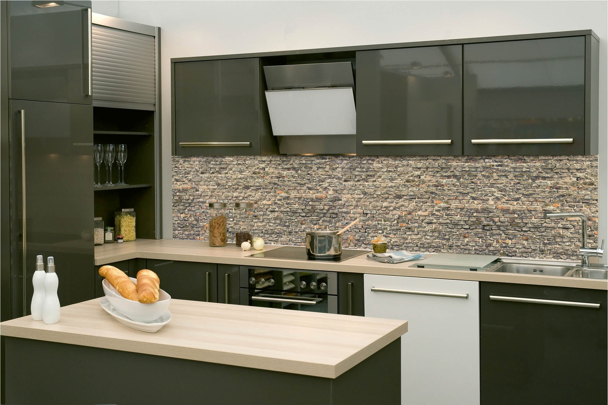 Küchenrückwandfolie lässt sich ausschließlich auf die nicht-saugfähige Unterlage kleben (Glas, Holz, keramische Fließen).