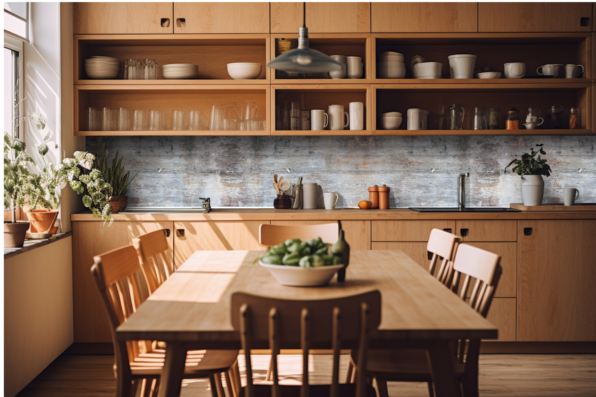 Küchenrückwandfolie lässt sich ausschließlich auf die nicht-saugfähige Unterlage kleben (Glas, Holz, keramische Fließen).
