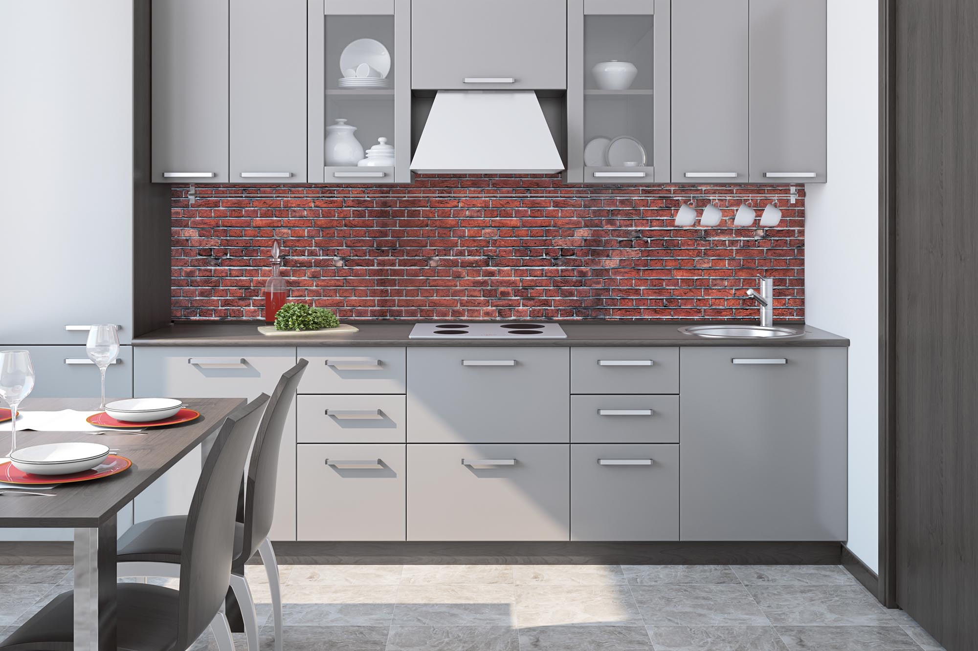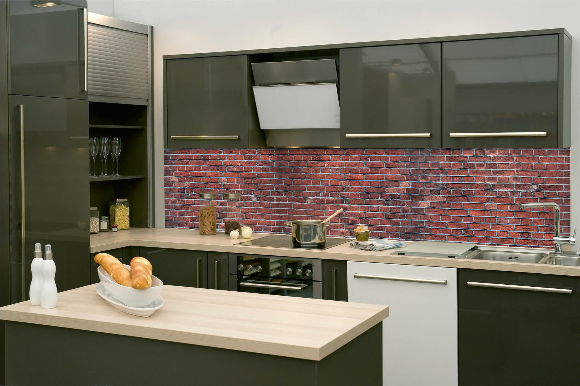 Küchenrückwandfolie lässt sich ausschließlich auf die nicht-saugfähige Unterlage kleben (Glas, Holz, keramische Fließen).