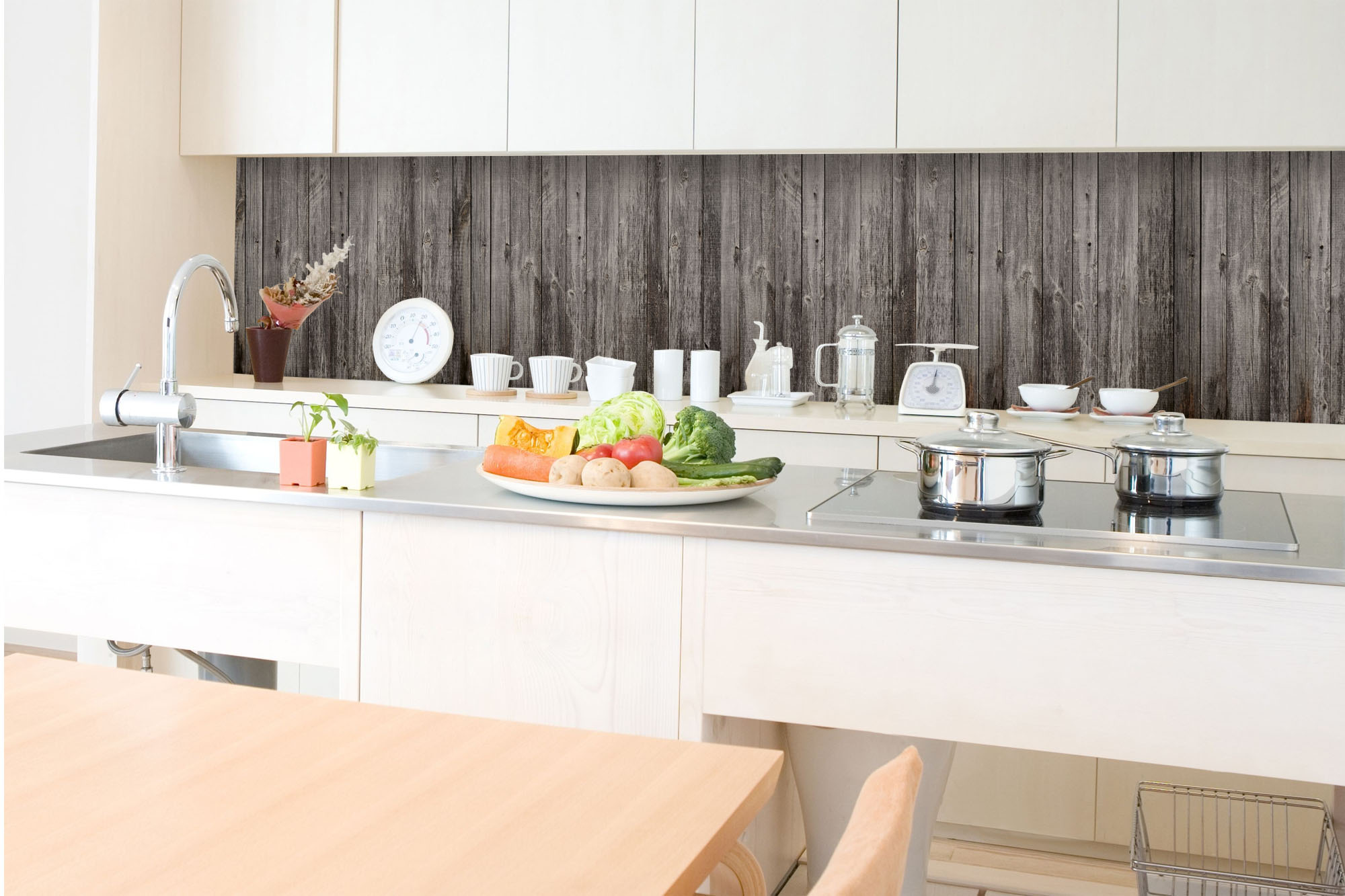 Küchenrückwandfolie lässt sich ausschließlich auf die nicht-saugfähige Unterlage kleben (Glas, Holz, keramische Fließen).