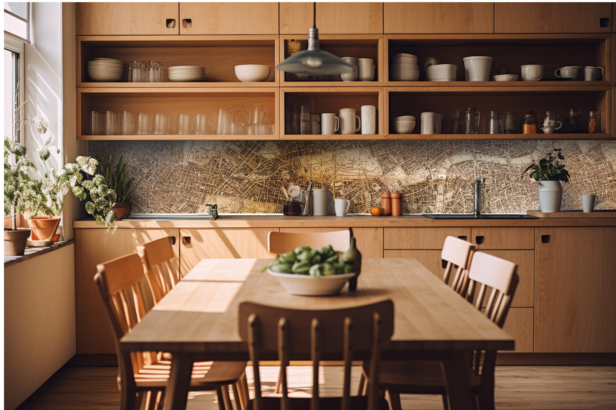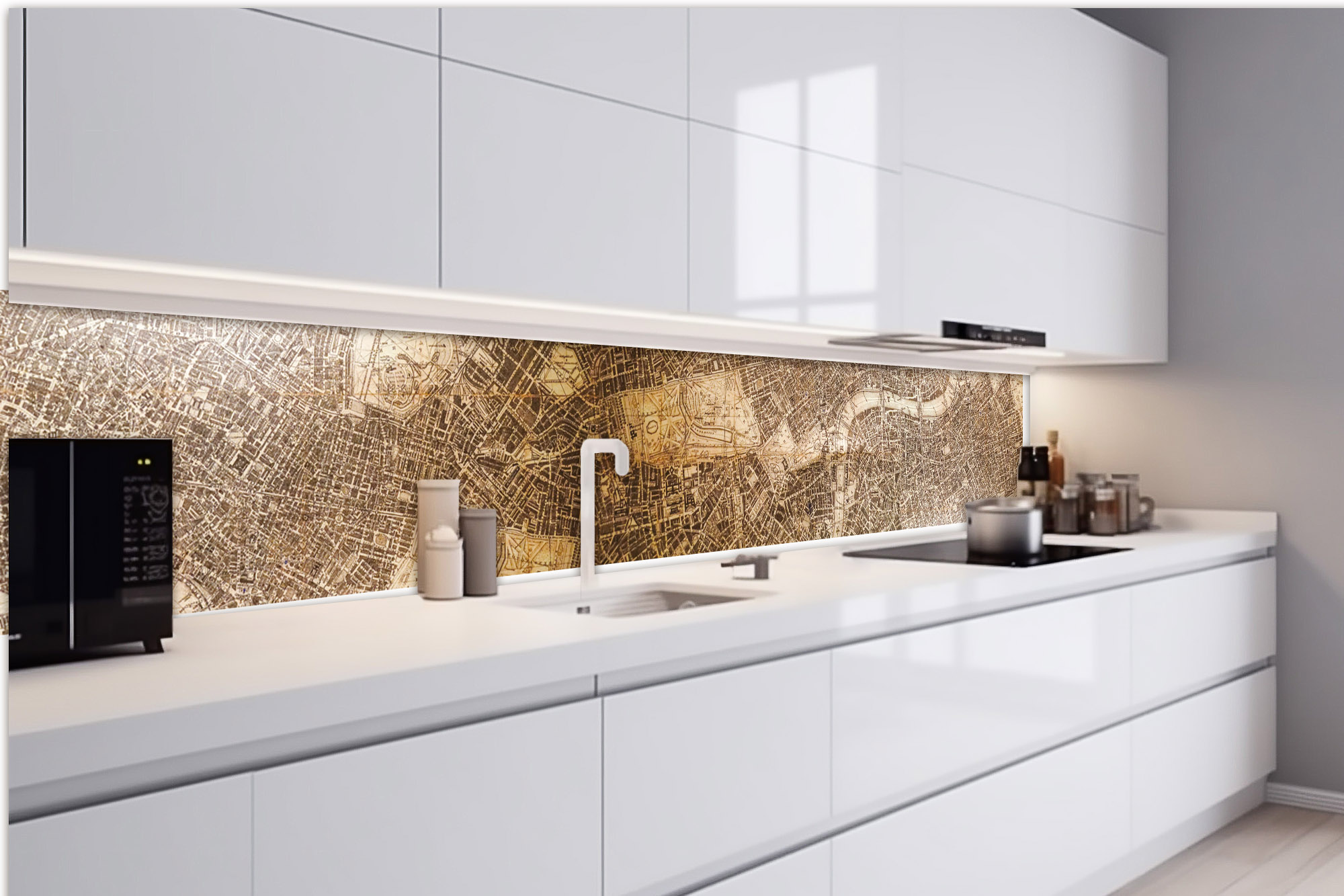 Die neusten Trends im Bereich Küchengestaltung machen auf selbstklebende Fototapeten für die Küchenrückwand aufmerksam. Anstelle einer Fliesenwand in der Küche kann die Rückwand mit einer Folie bedeckt werden.
