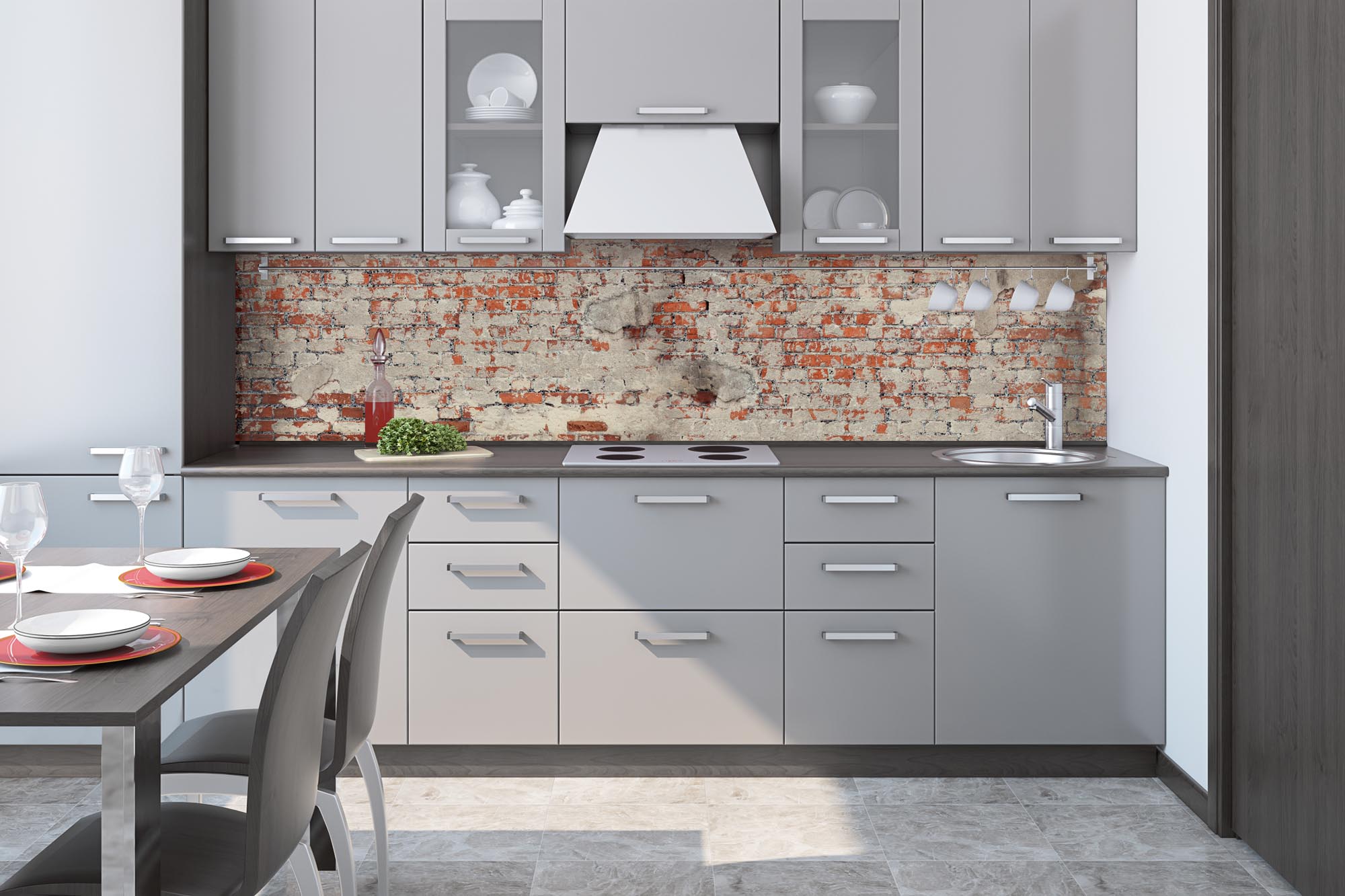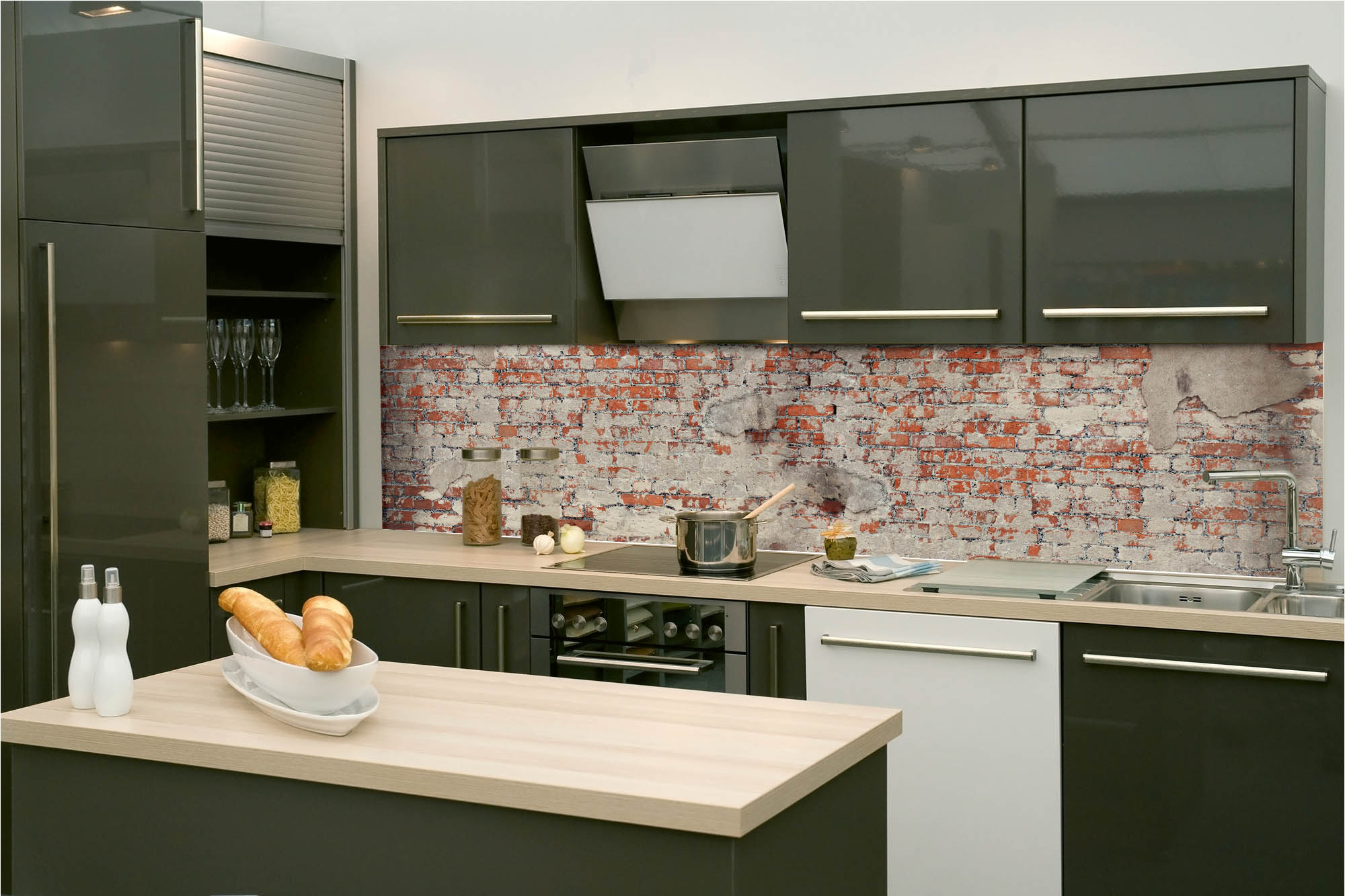 Küchenrückwandfolie lässt sich ausschließlich auf die nicht-saugfähige Unterlage kleben (Glas, Holz, keramische Fließen).