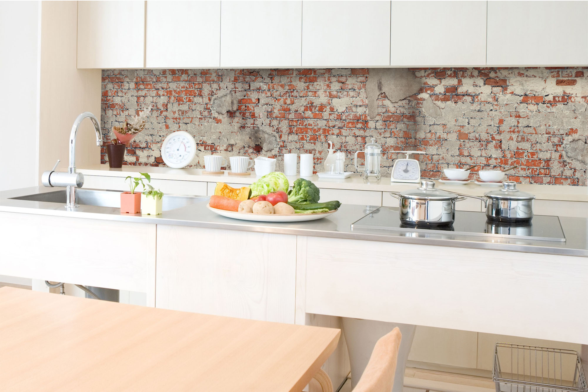Küchenrückwandfolie lässt sich ausschließlich auf die nicht-saugfähige Unterlage kleben (Glas, Holz, keramische Fließen).