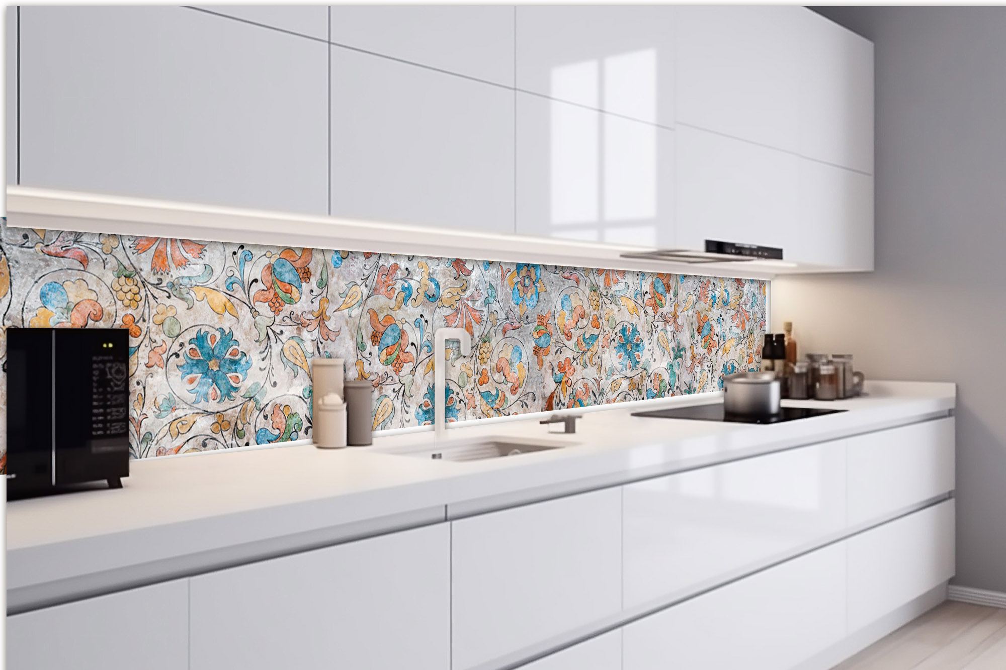 Küchenrückwandfolie lässt sich ausschließlich auf die nicht-saugfähige Unterlage kleben (Glas, Holz, keramische Fließen).