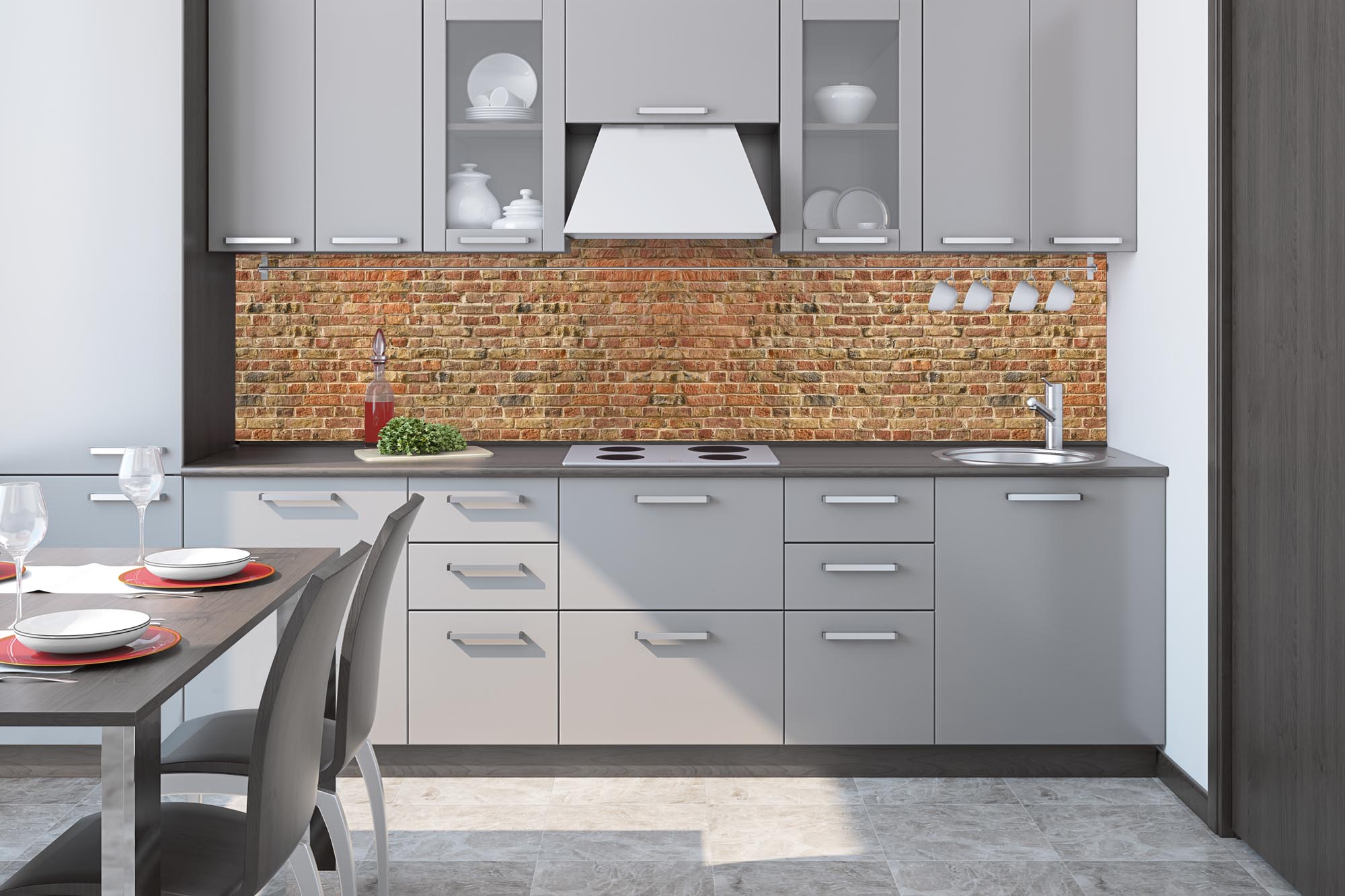 Küchenrückwandfolie lässt sich ausschließlich auf die nicht-saugfähige Unterlage kleben (Glas, Holz, keramische Fließen).
