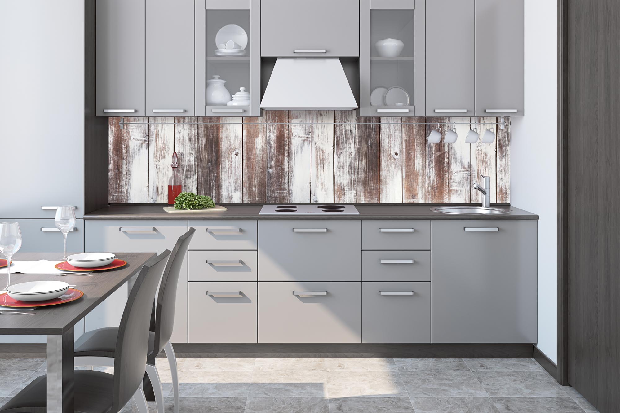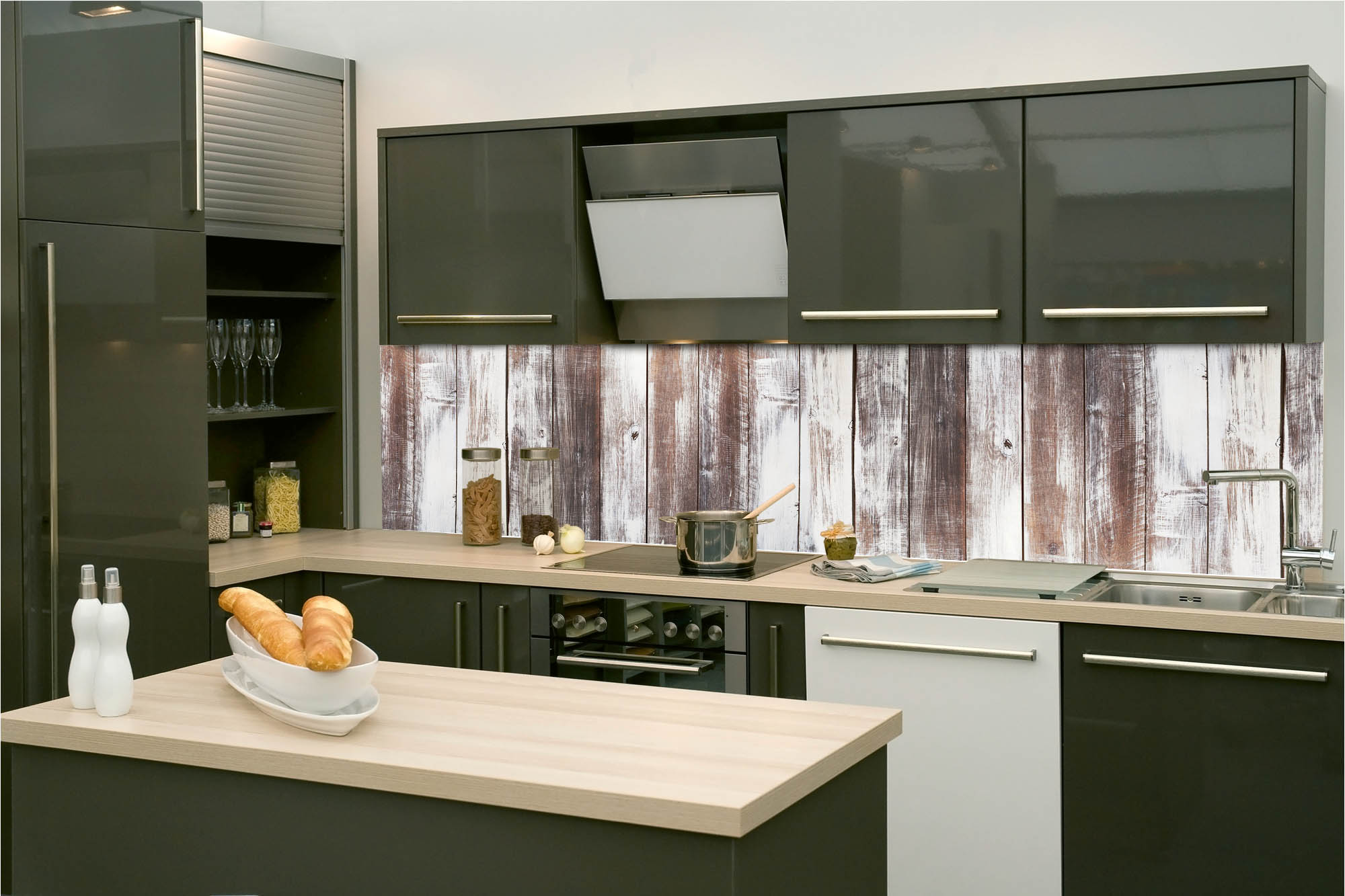 Küchenrückwandfolie lässt sich ausschließlich auf die nicht-saugfähige Unterlage kleben (Glas, Holz, keramische Fließen).