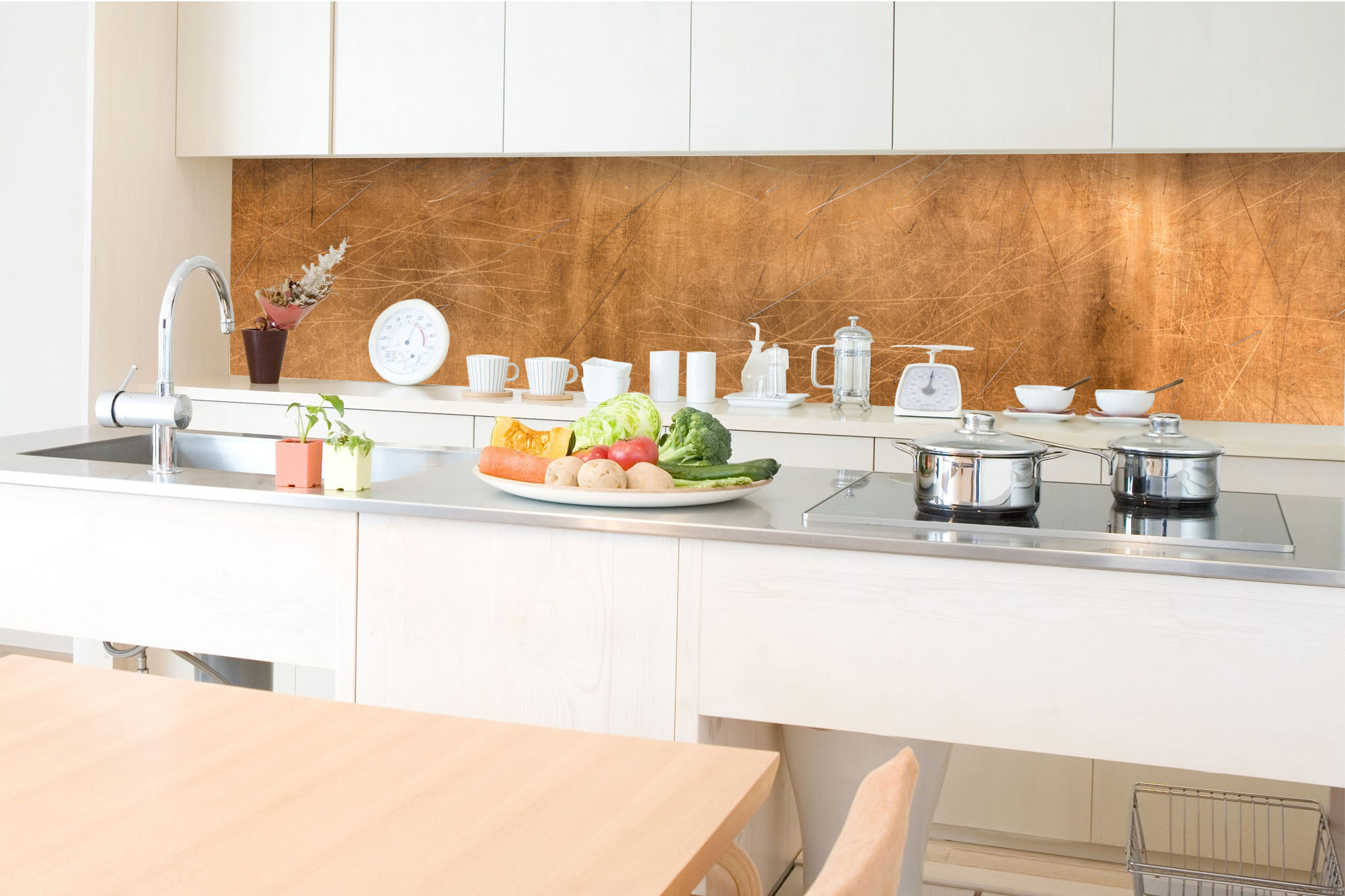 Küchenrückwandfolie lässt sich ausschließlich auf die nicht-saugfähige Unterlage kleben (Glas, Holz, keramische Fließen).