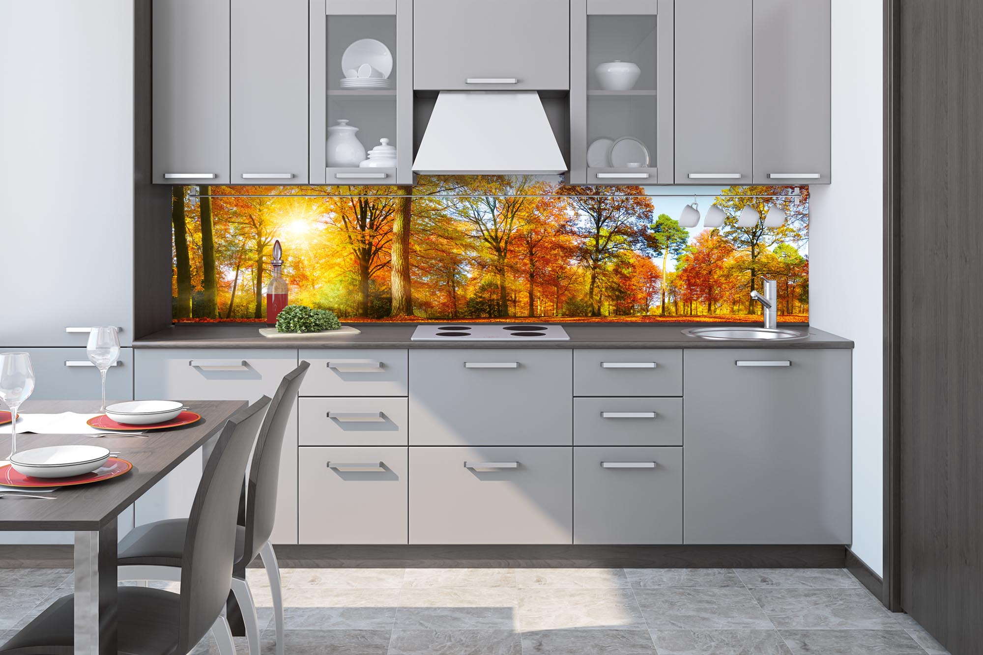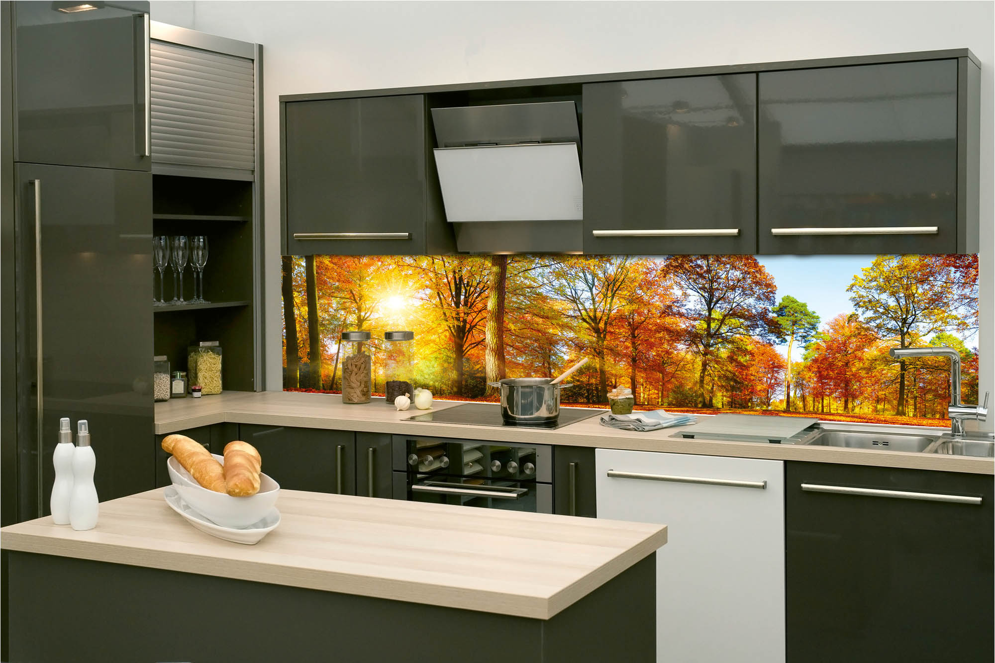 Die neusten Trends im Bereich Küchengestaltung machen auf selbstklebende Fototapeten für die Küchenrückwand aufmerksam. Anstelle einer Fliesenwand in der Küche kann die Rückwand mit einer Folie bedeckt werden.