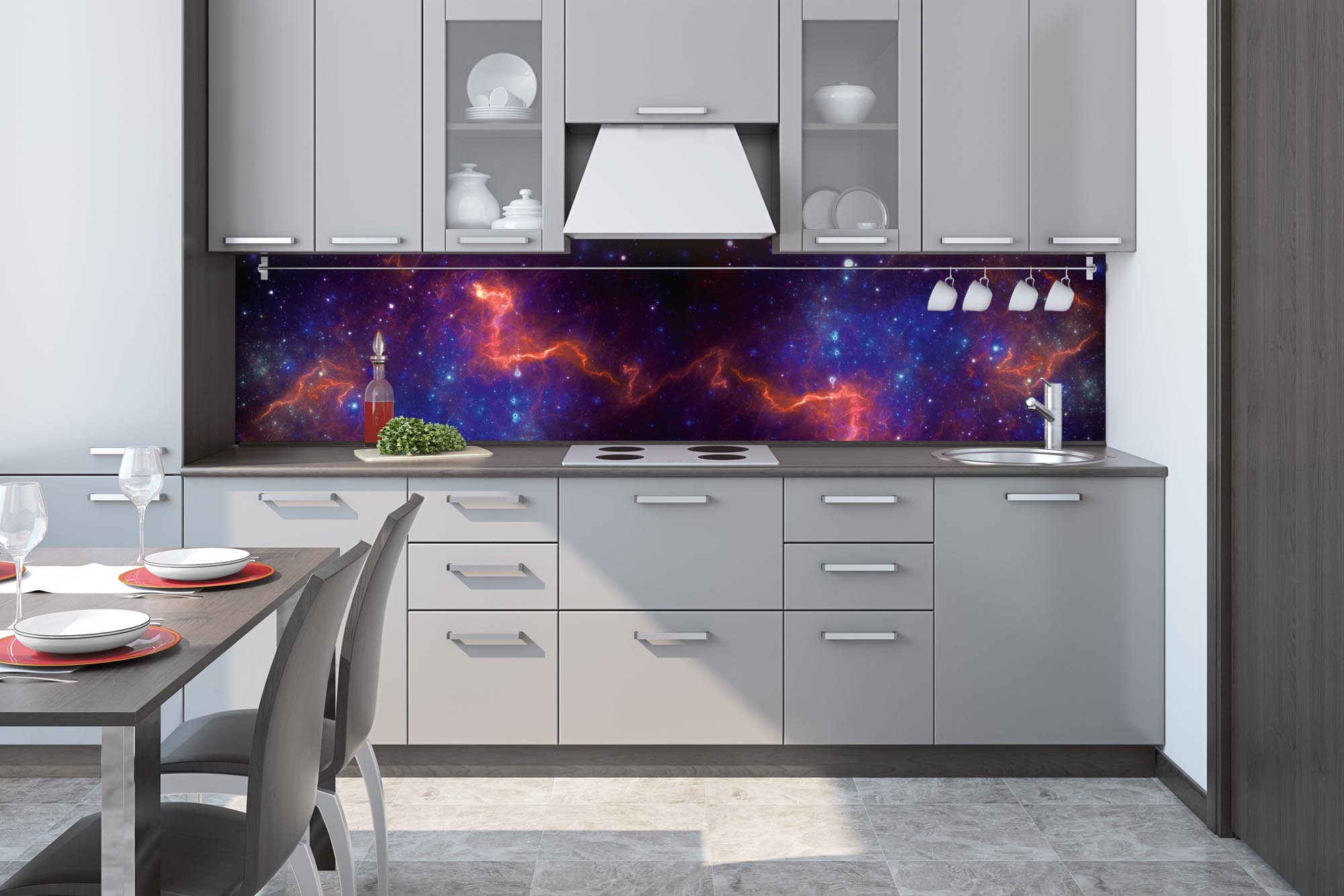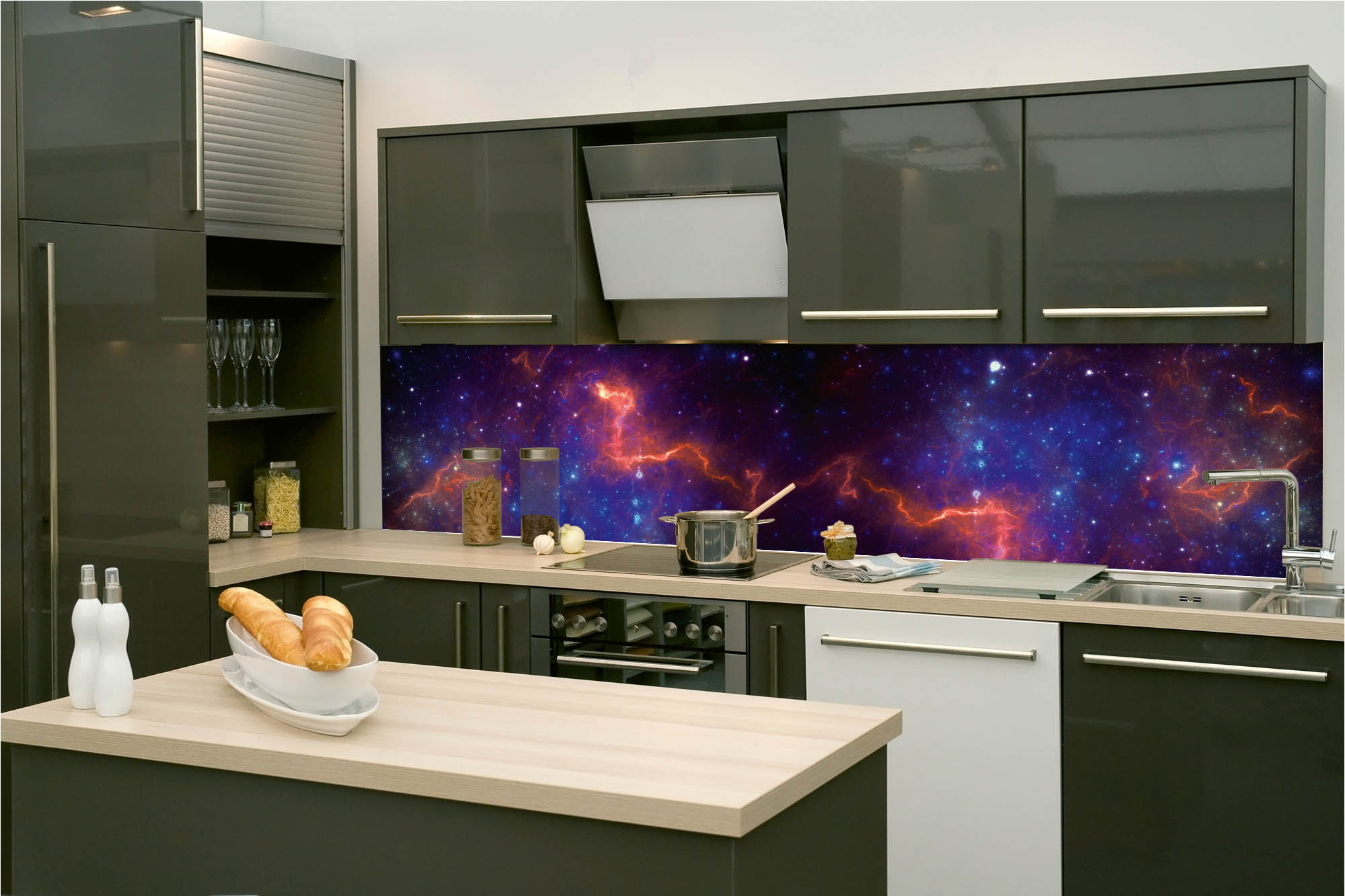 Die neusten Trends im Bereich Küchengestaltung machen auf selbstklebende Fototapeten für die Küchenrückwand aufmerksam. Anstelle einer Fliesenwand in der Küche kann die Rückwand mit einer Folie bedeckt werden.