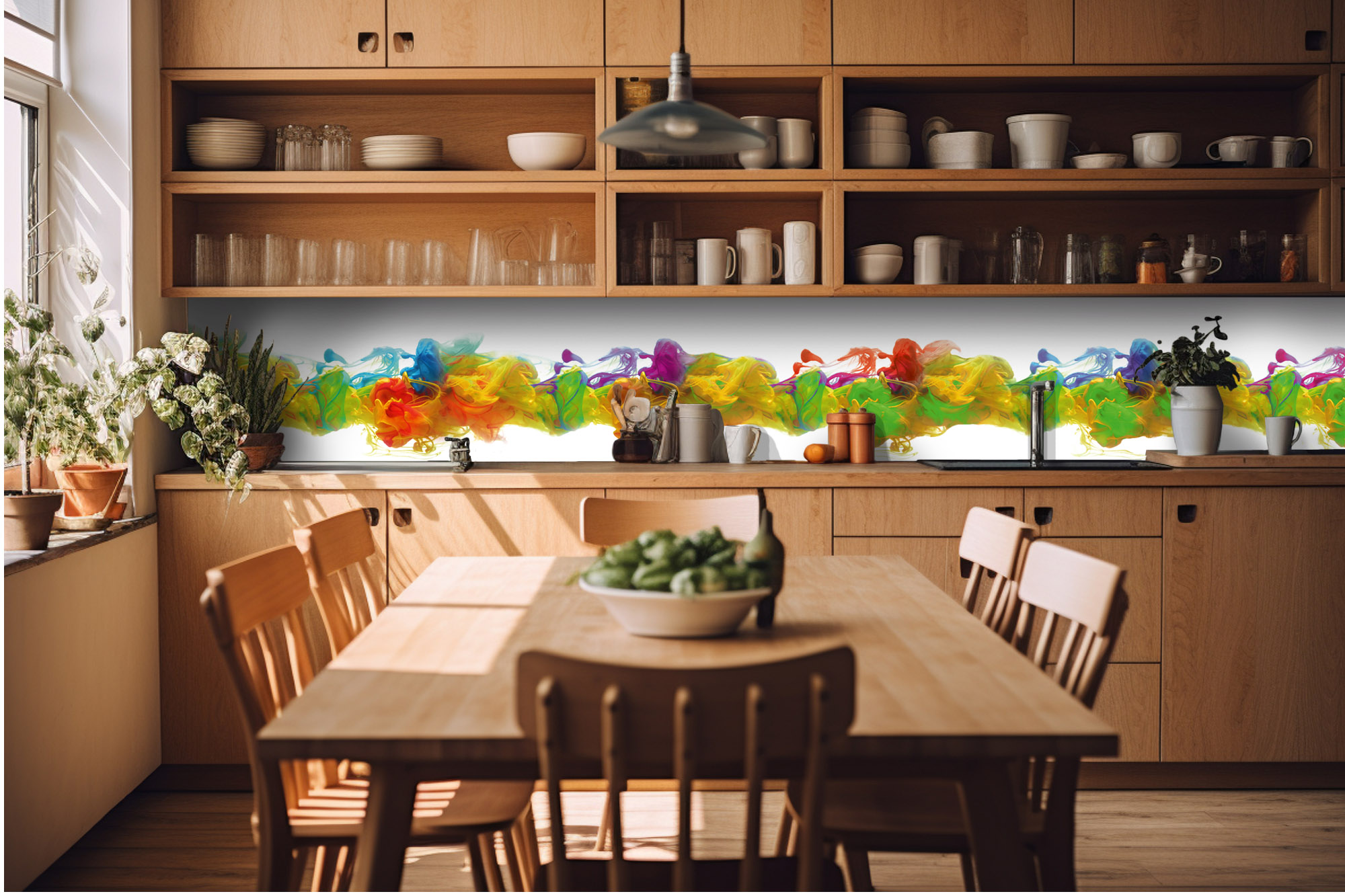 Küchenrückwandfolie lässt sich ausschließlich auf die nicht-saugfähige Unterlage kleben (Glas, Holz, keramische Fließen).