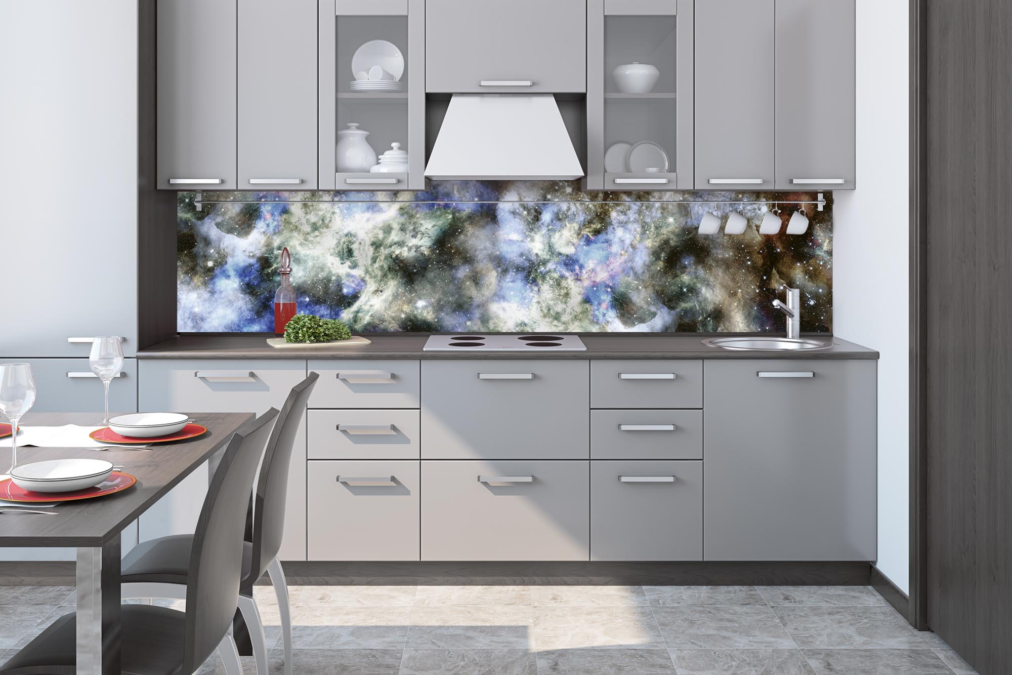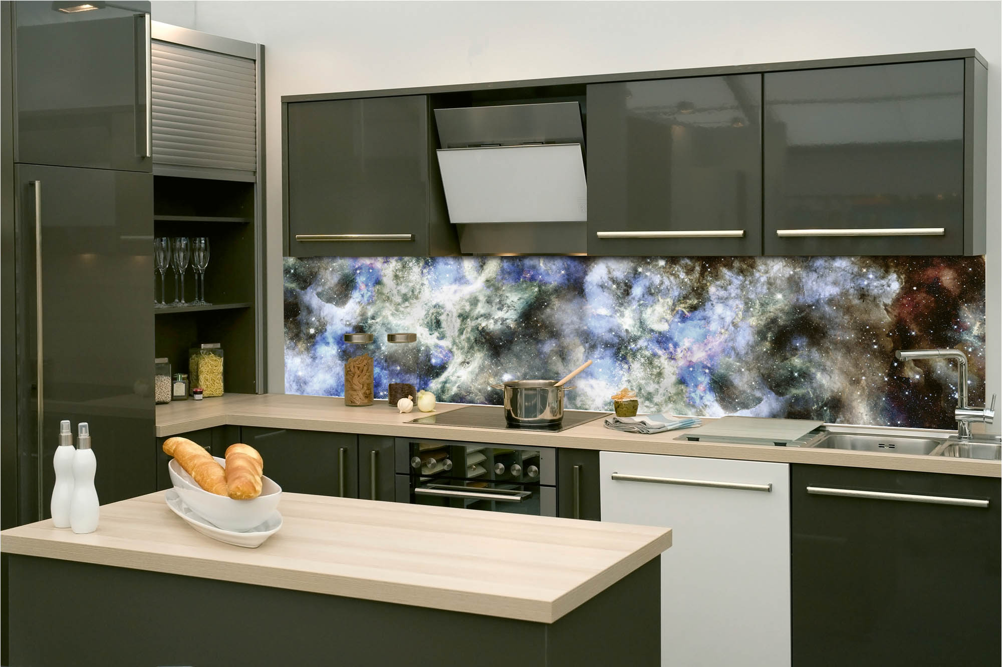 Die neusten Trends im Bereich Küchengestaltung machen auf selbstklebende Fototapeten für die Küchenrückwand aufmerksam. Anstelle einer Fliesenwand in der Küche kann die Rückwand mit einer Folie bedeckt werden.