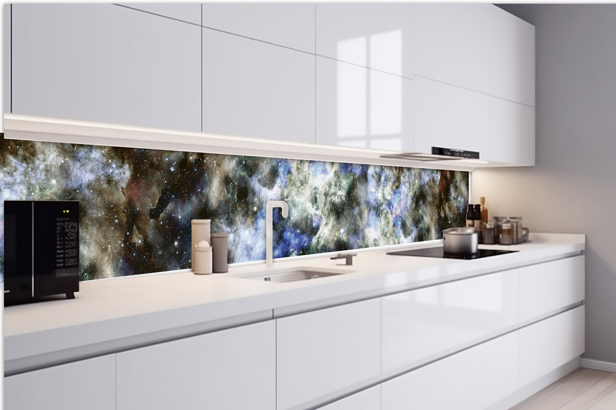 Küchenrückwandfolie lässt sich ausschließlich auf die nicht-saugfähige Unterlage kleben (Glas, Holz, keramische Fließen).