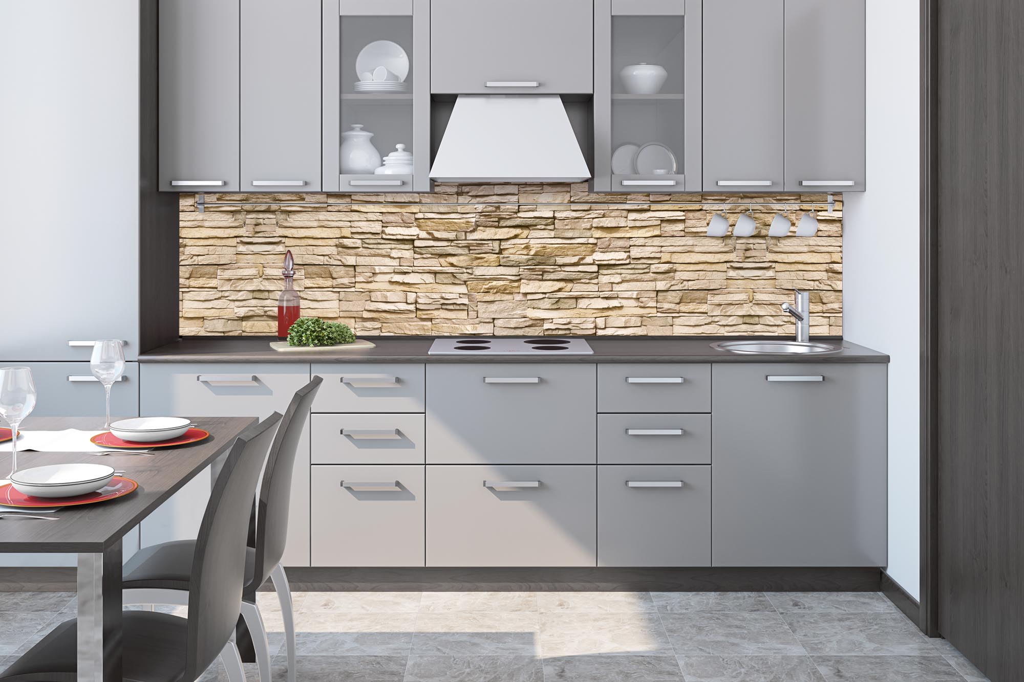 Küchenrückwandfolie lässt sich ausschließlich auf die nicht-saugfähige Unterlage kleben (Glas, Holz, keramische Fließen).