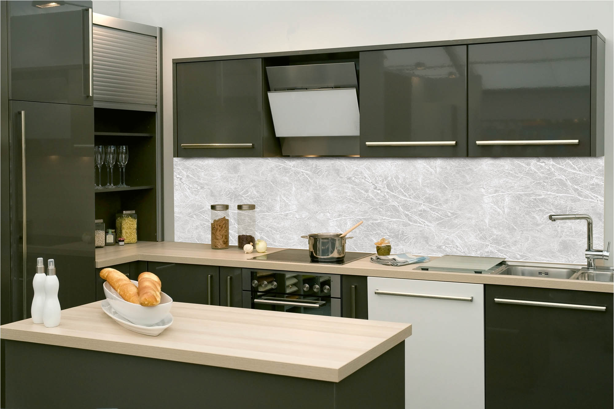 Küchenrückwandfolie lässt sich ausschließlich auf die nicht-saugfähige Unterlage kleben (Glas, Holz, keramische Fließen).