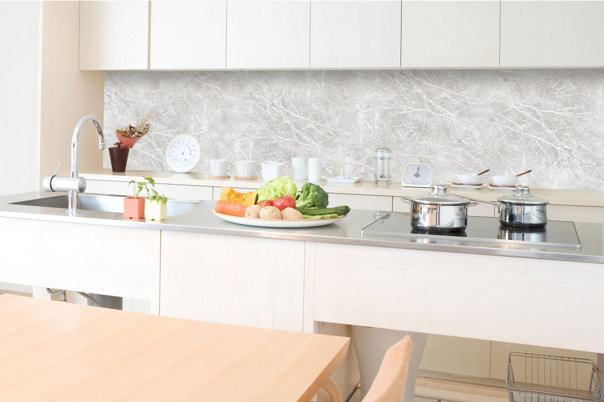 Küchenrückwandfolie lässt sich ausschließlich auf die nicht-saugfähige Unterlage kleben (Glas, Holz, keramische Fließen).