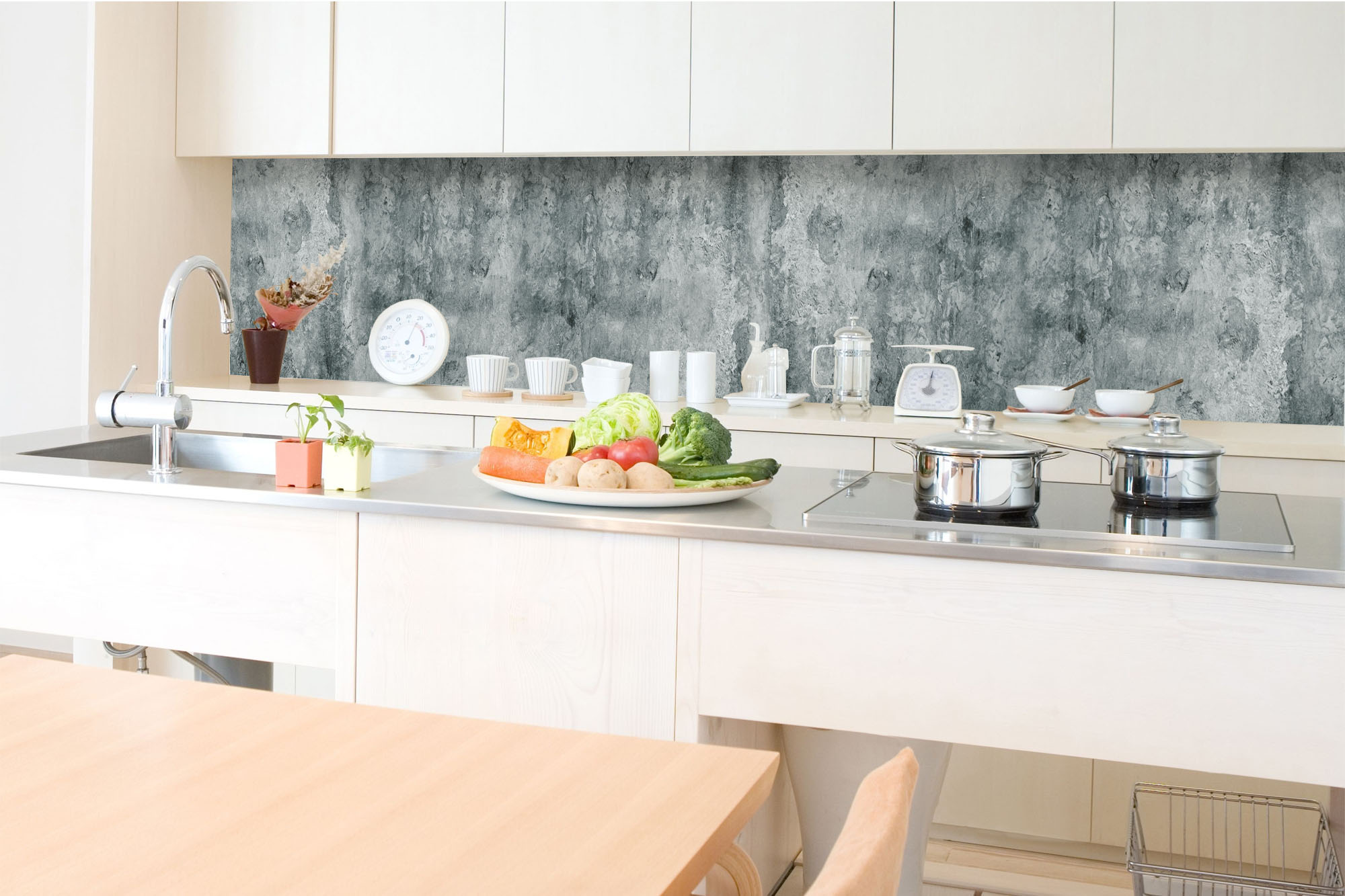 Küchenrückwandfolie lässt sich ausschließlich auf die nicht-saugfähige Unterlage kleben (Glas, Holz, keramische Fließen).