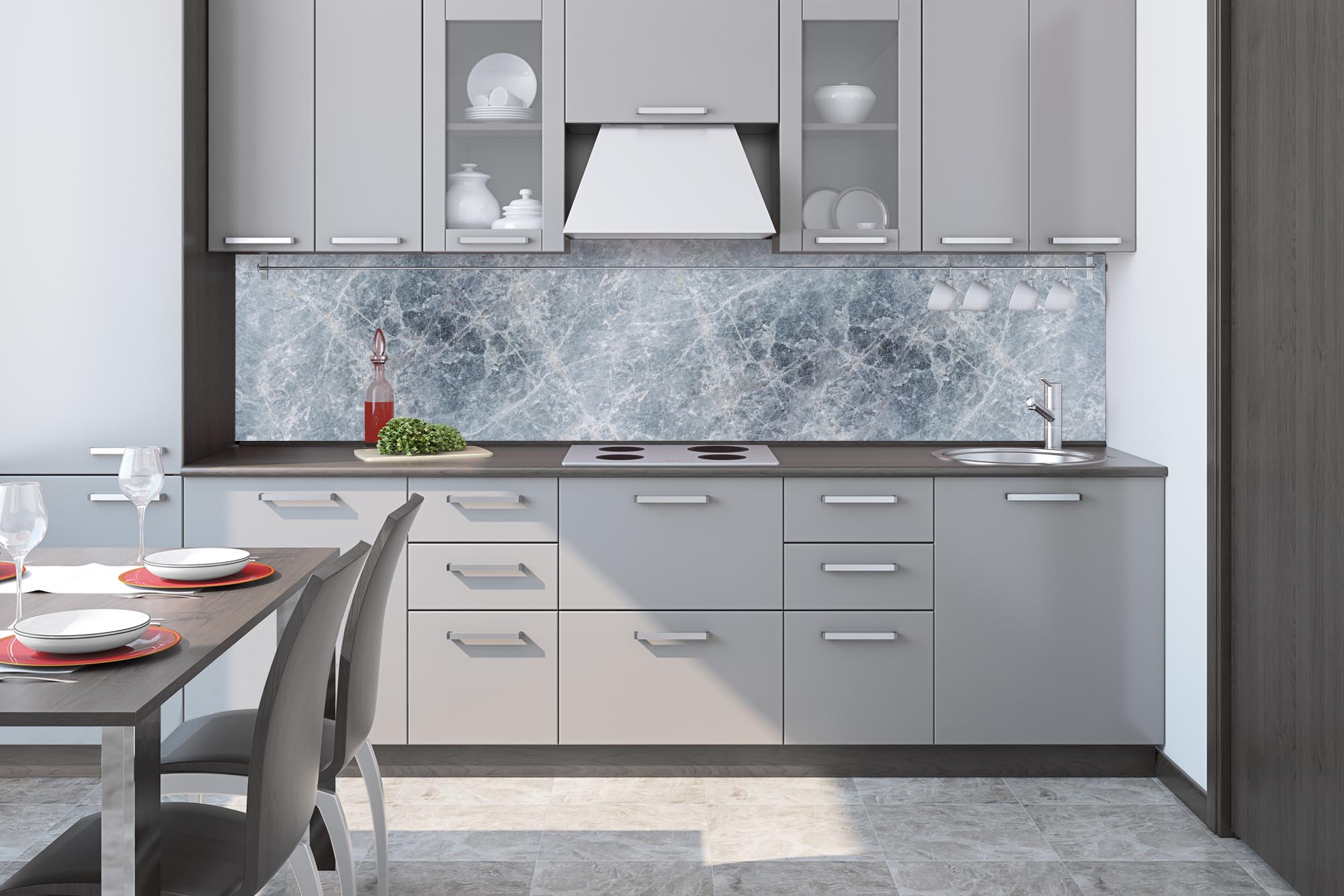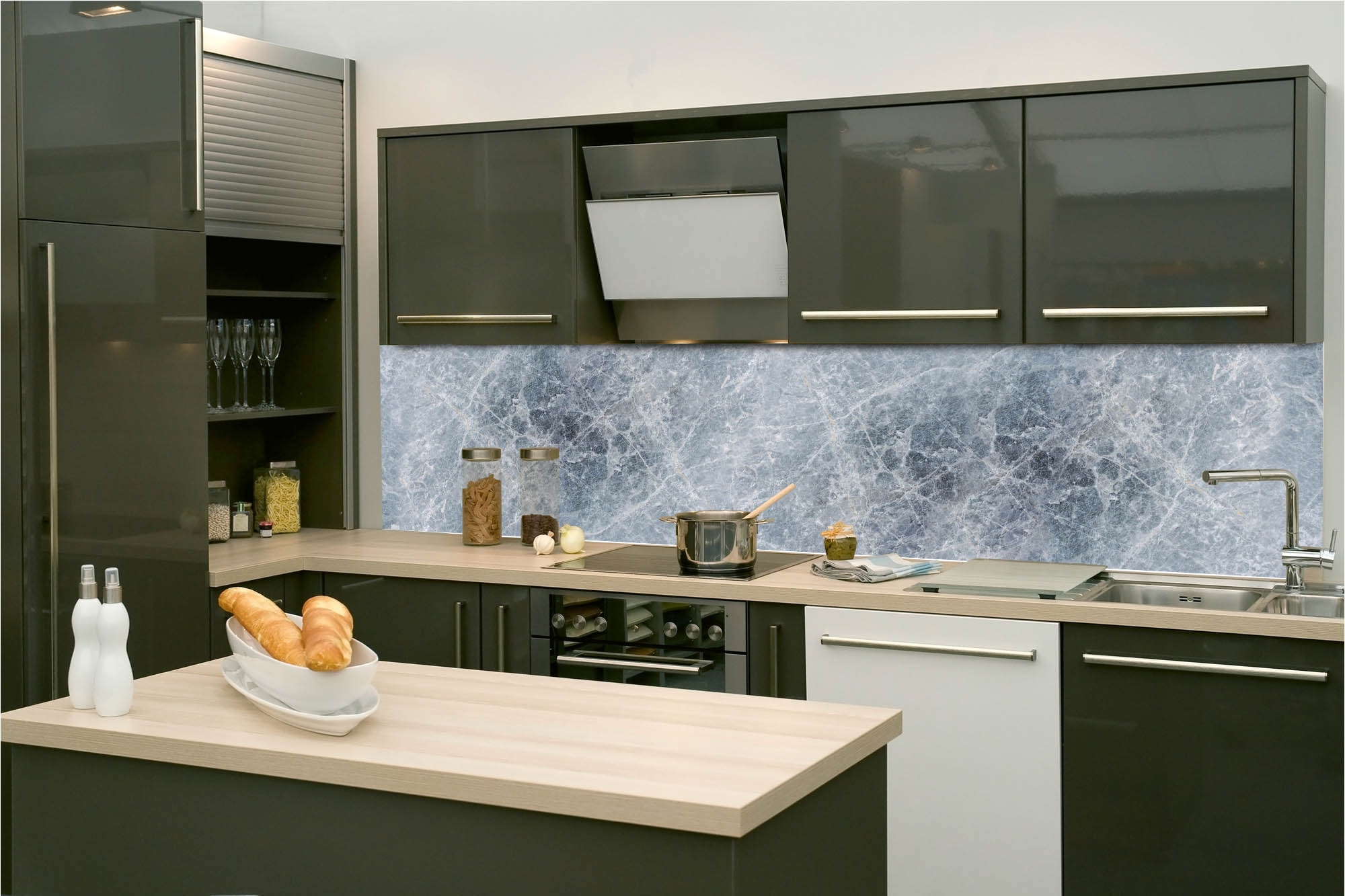 Küchenrückwandfolie lässt sich ausschließlich auf die nicht-saugfähige Unterlage kleben (Glas, Holz, keramische Fließen).
