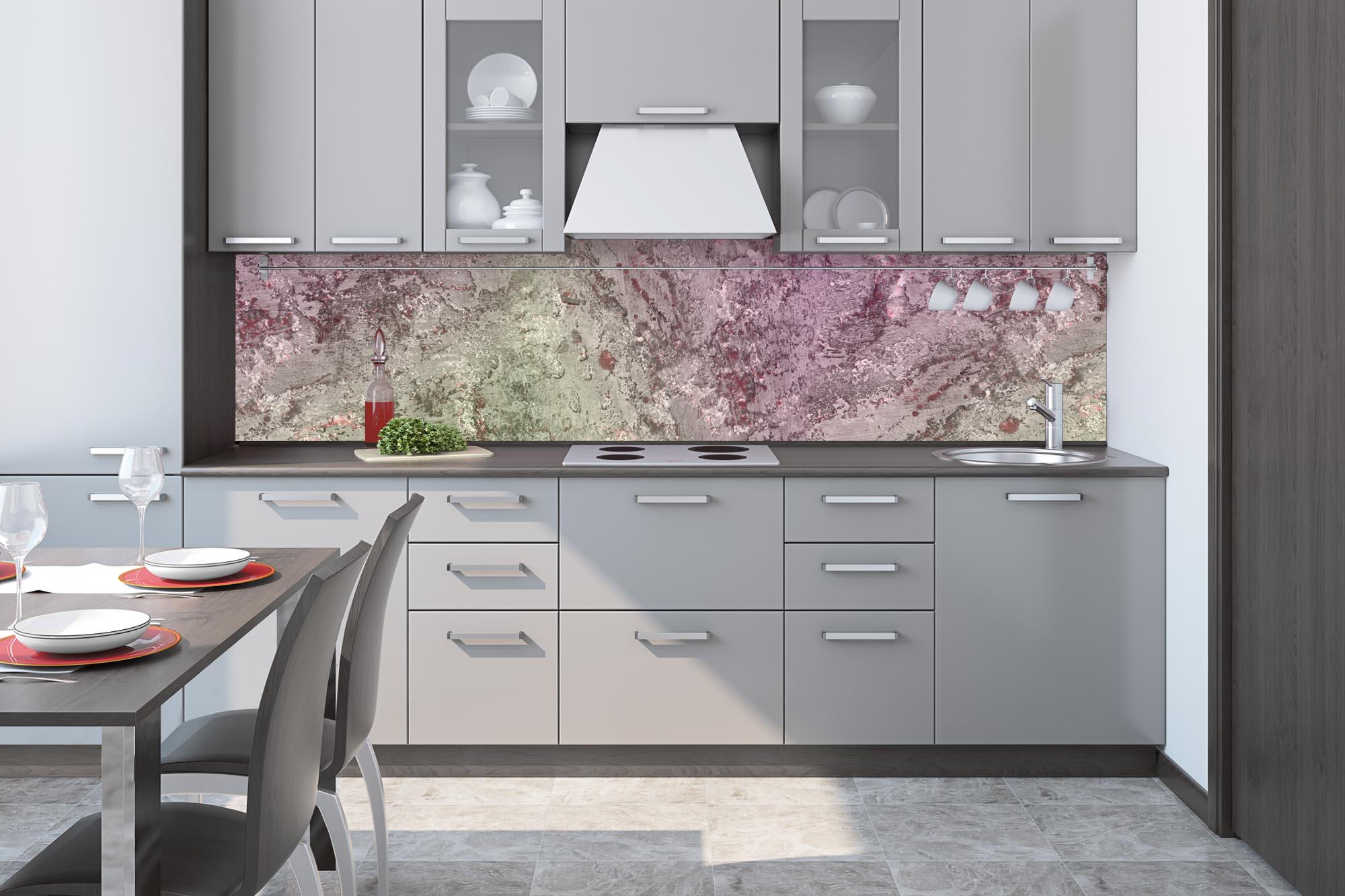 Küchenrückwandfolie lässt sich ausschließlich auf die nicht-saugfähige Unterlage kleben (Glas, Holz, keramische Fließen).