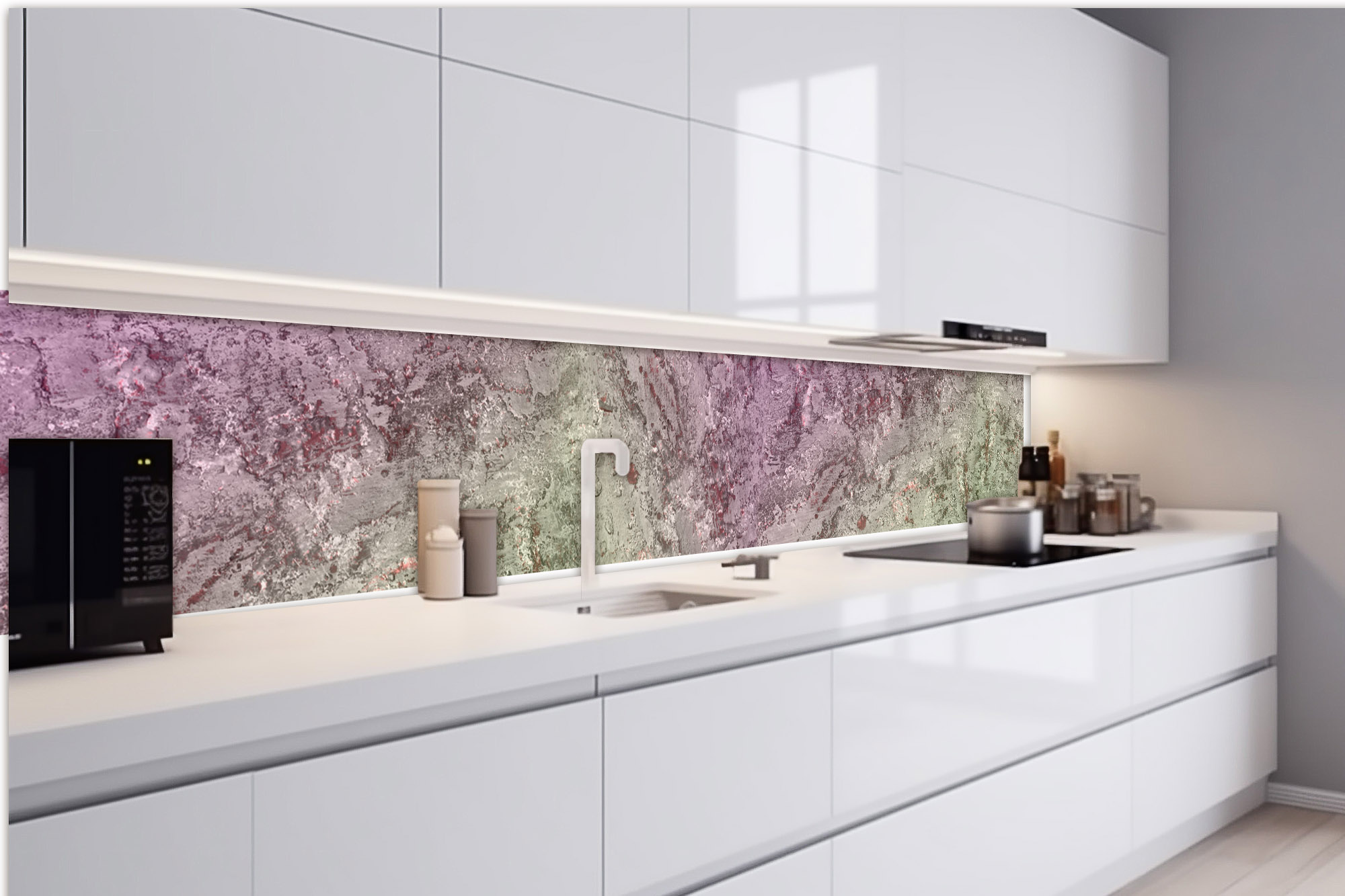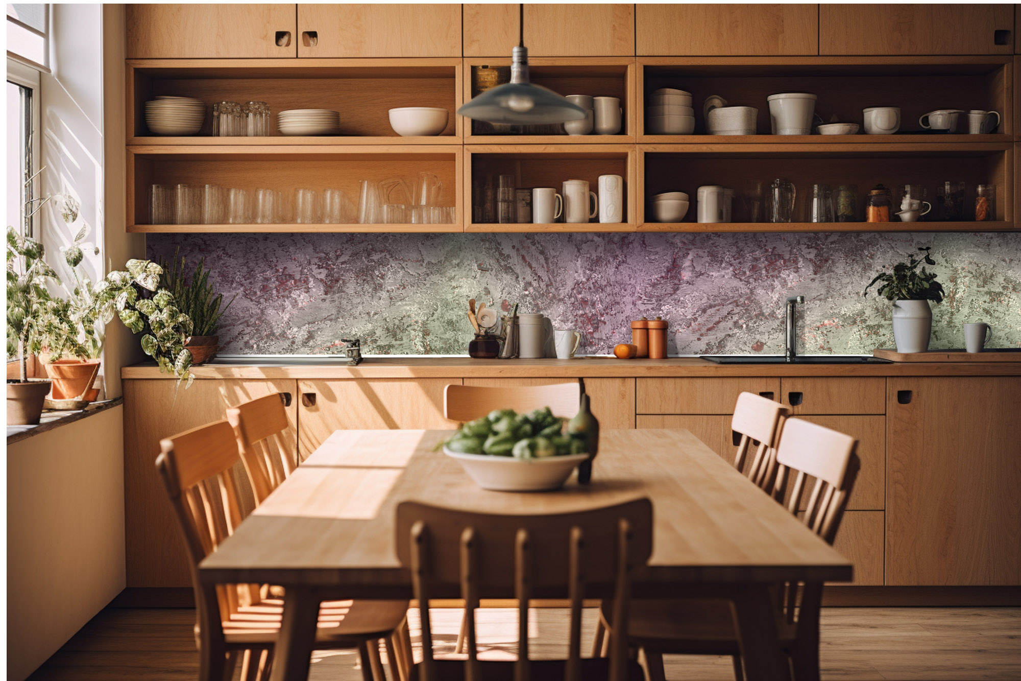 Küchenrückwandfolie lässt sich ausschließlich auf die nicht-saugfähige Unterlage kleben (Glas, Holz, keramische Fließen).