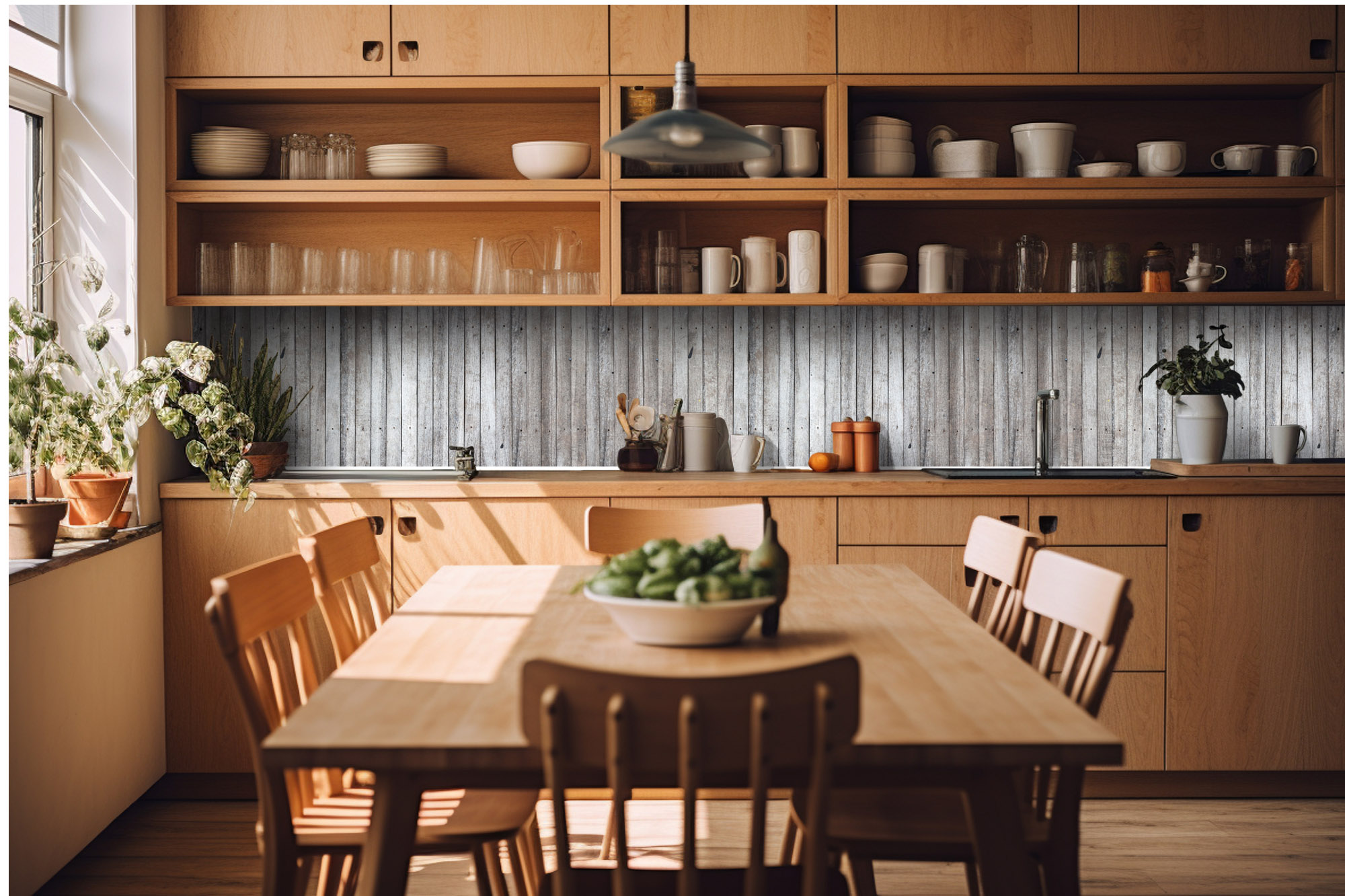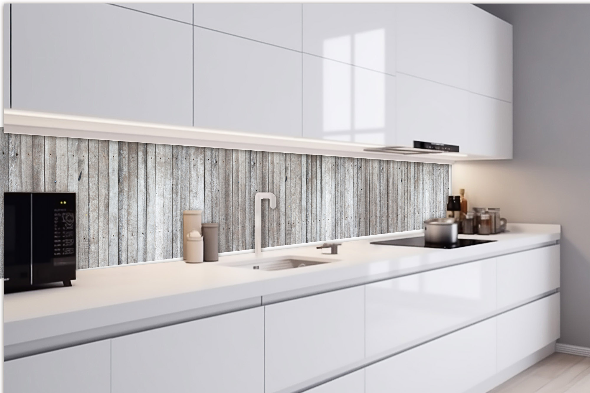 Küchenrückwandfolie lässt sich ausschließlich auf die nicht-saugfähige Unterlage kleben (Glas, Holz, keramische Fließen).