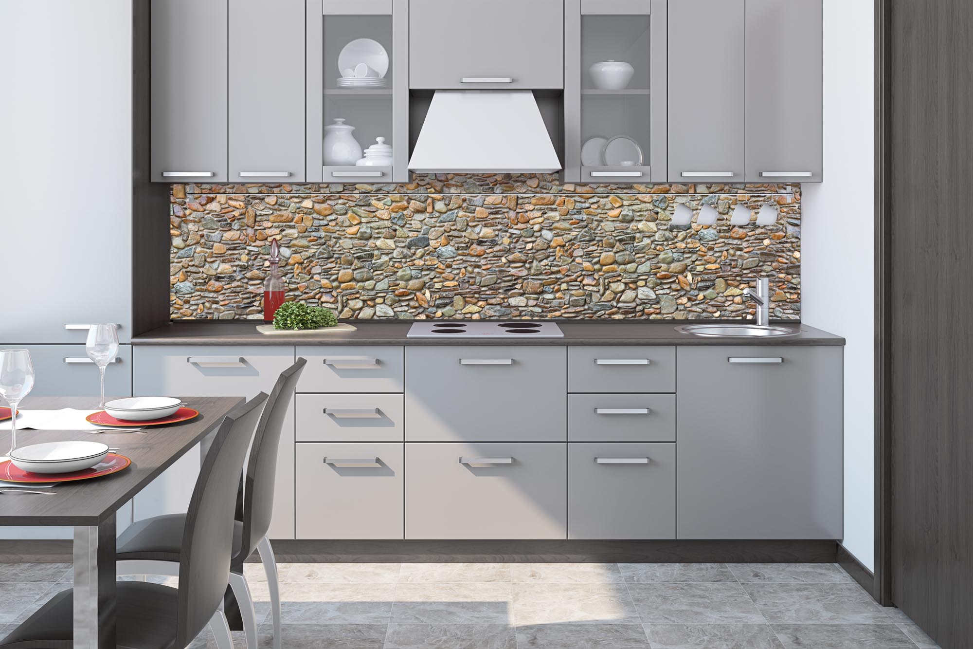 Küchenrückwandfolie lässt sich ausschließlich auf die nicht-saugfähige Unterlage kleben (Glas, Holz, keramische Fließen).