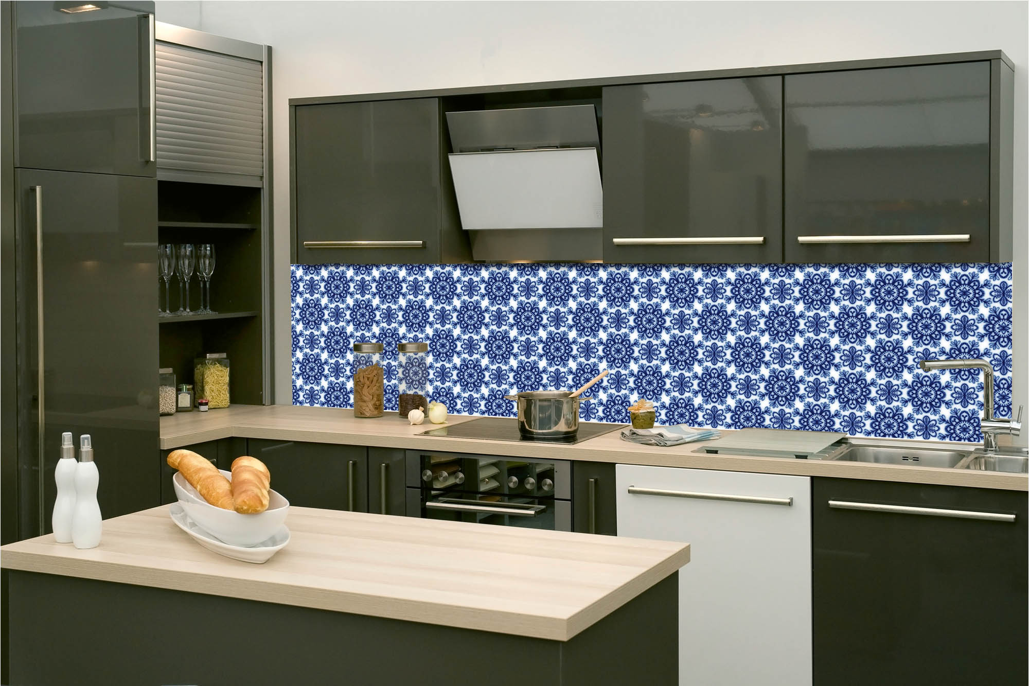 Küchenrückwandfolie lässt sich ausschließlich auf die nicht-saugfähige Unterlage kleben (Glas, Holz, keramische Fließen).